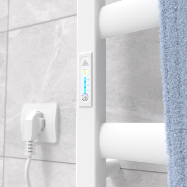 Calorifer baie portprosop electric Laris Atlant CK8 500x900 L este dotat cu un regulator de temperatură bazat pe microprocesor (control prin apăsare de buton). Pentru a porni funcționarea, setați temperatura dorită. Un senzor de temperatură monitorizează temperatura suprafeței suportului încălzit pentru prosoape, prevenind supraîncălzirea. Caracteristicile includ un economizor de mod (care restabilește automat modul programat de utilizator atunci când este oprit), un temporizator de oprire de 3 ore și indicatori de funcționare color. Temperatura suprafeței este de 50±5°C. Suportul măsoară 30x30 mm și are o grosime de 1,5 mm; traversa ovală măsoară 32x18 mm și are o grosime de 1,5 mm.