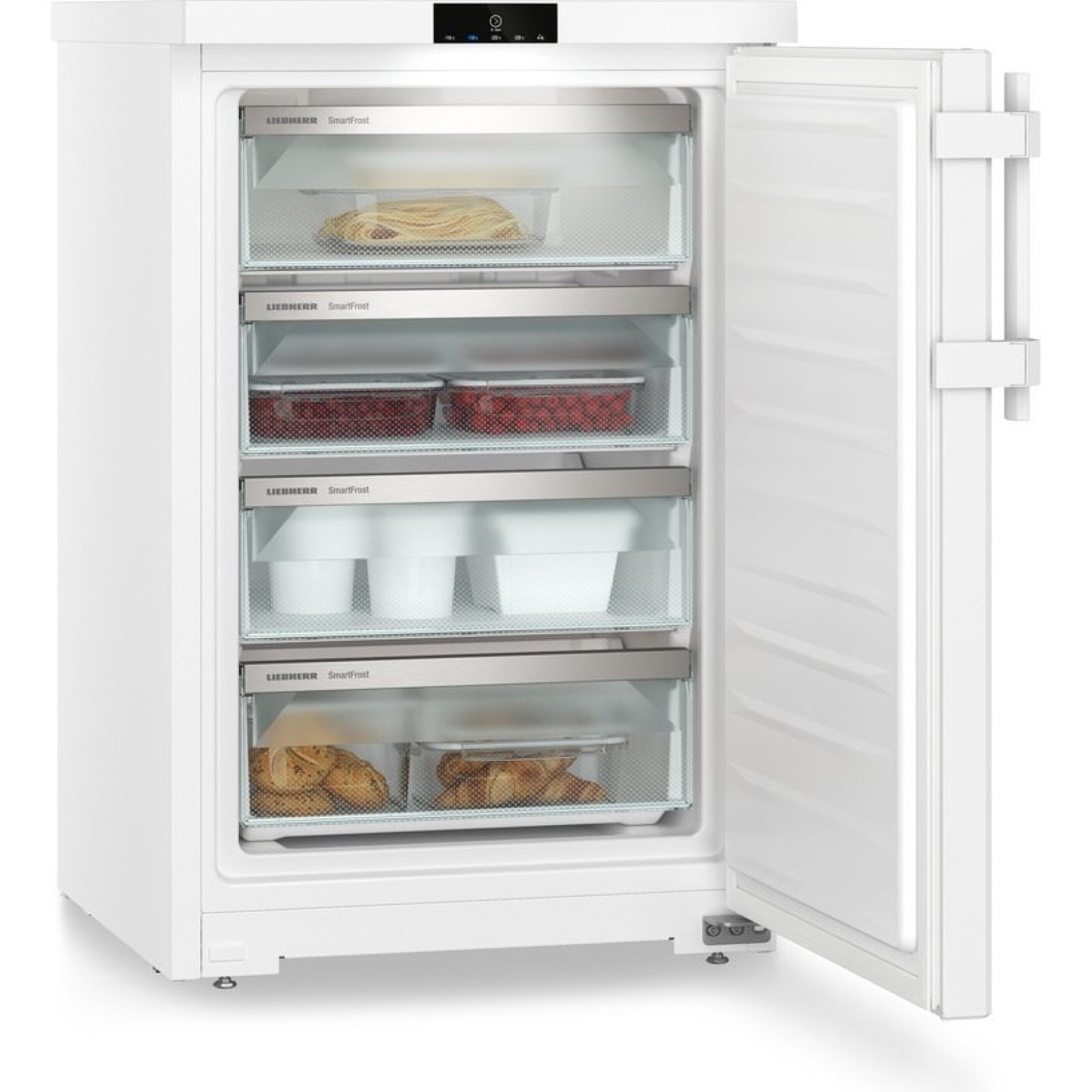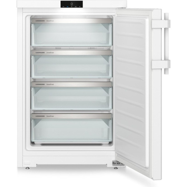 Congelatorul Liebherr FE 1404 este echipat cu patru sertare din sticlă care se extrag ușor datorită ghidajelor încorporate.