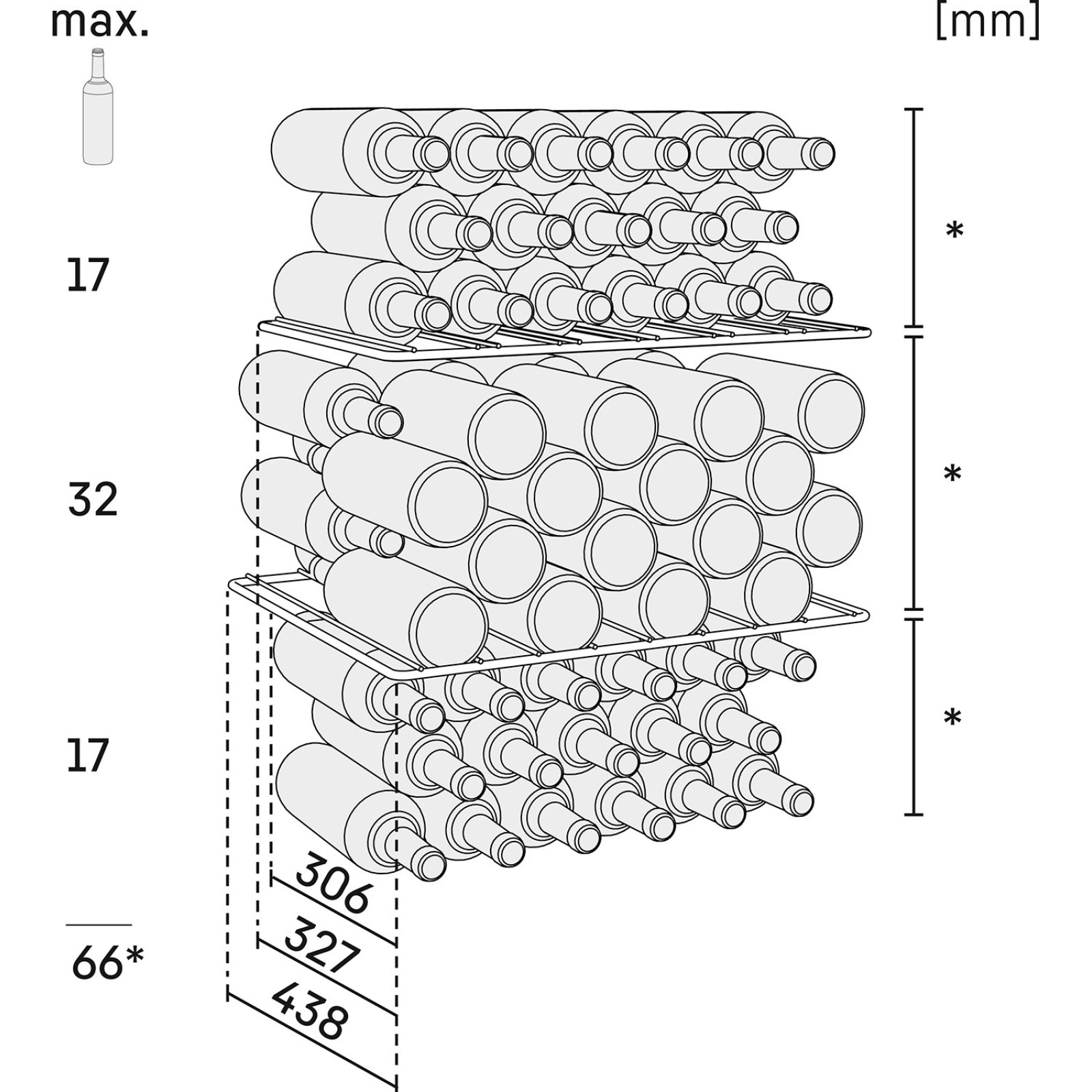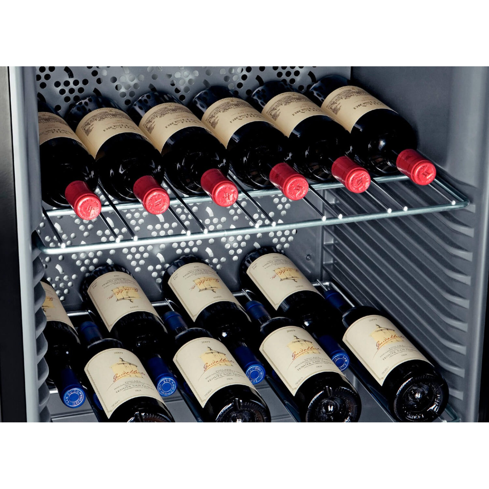 Frigiderul este echipat cu trei rafturi metalice care pot fi ajustate pentru a se potrivi dimensiunii sticlelor. Ușa opacă protejează vinul de lumină. Balamalele reversibile ale ușii oferă un confort suplimentar în timpul instalării.