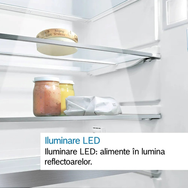 Becurile LED de lungă durată și economice iluminează automat interiorul cu lumină albă strălucitoare, oferind o iluminare confortabilă, luminoasă, uniformă și fără strălucire. Iluminarea LED vă ajută să monitorizați întregul conținut al frigiderului.