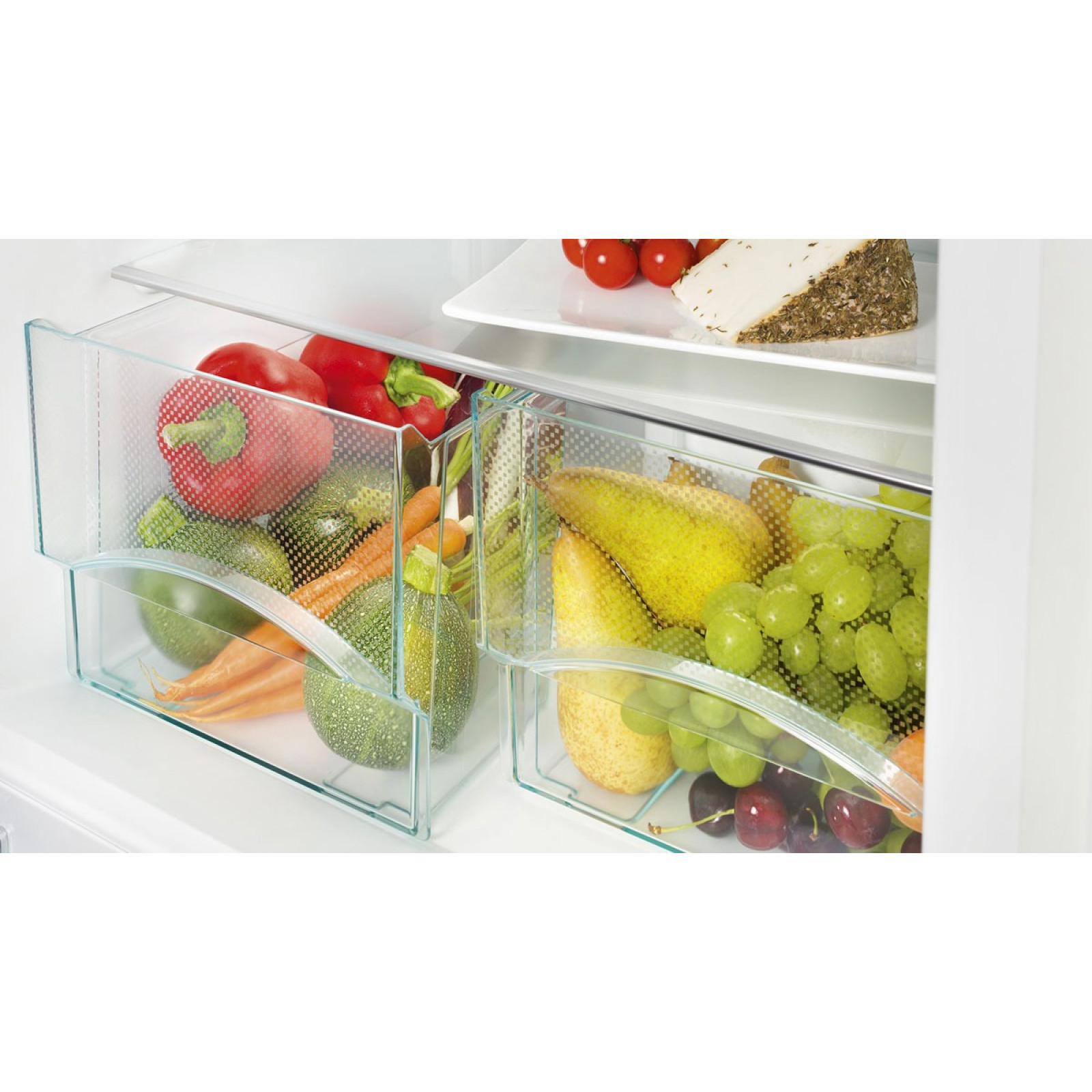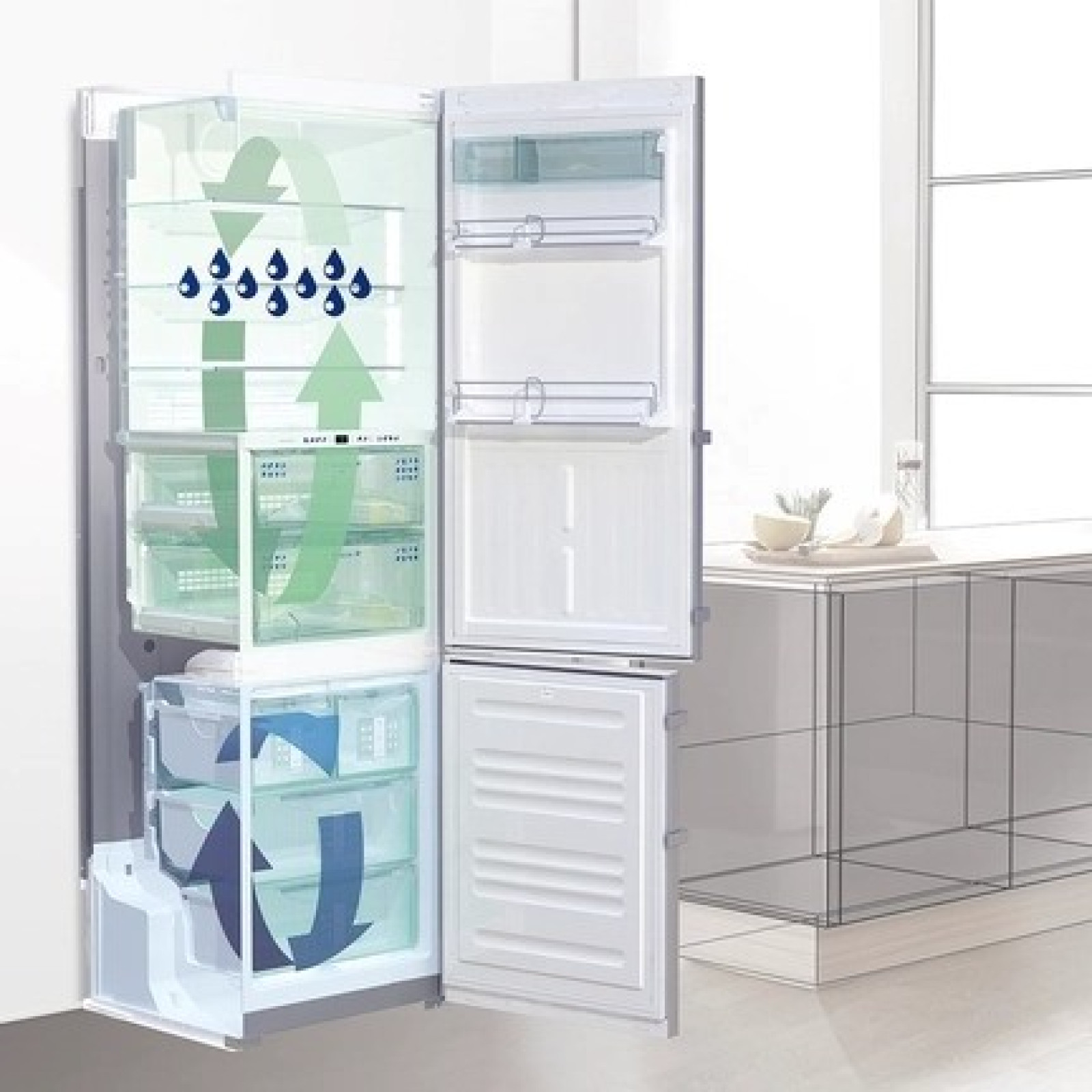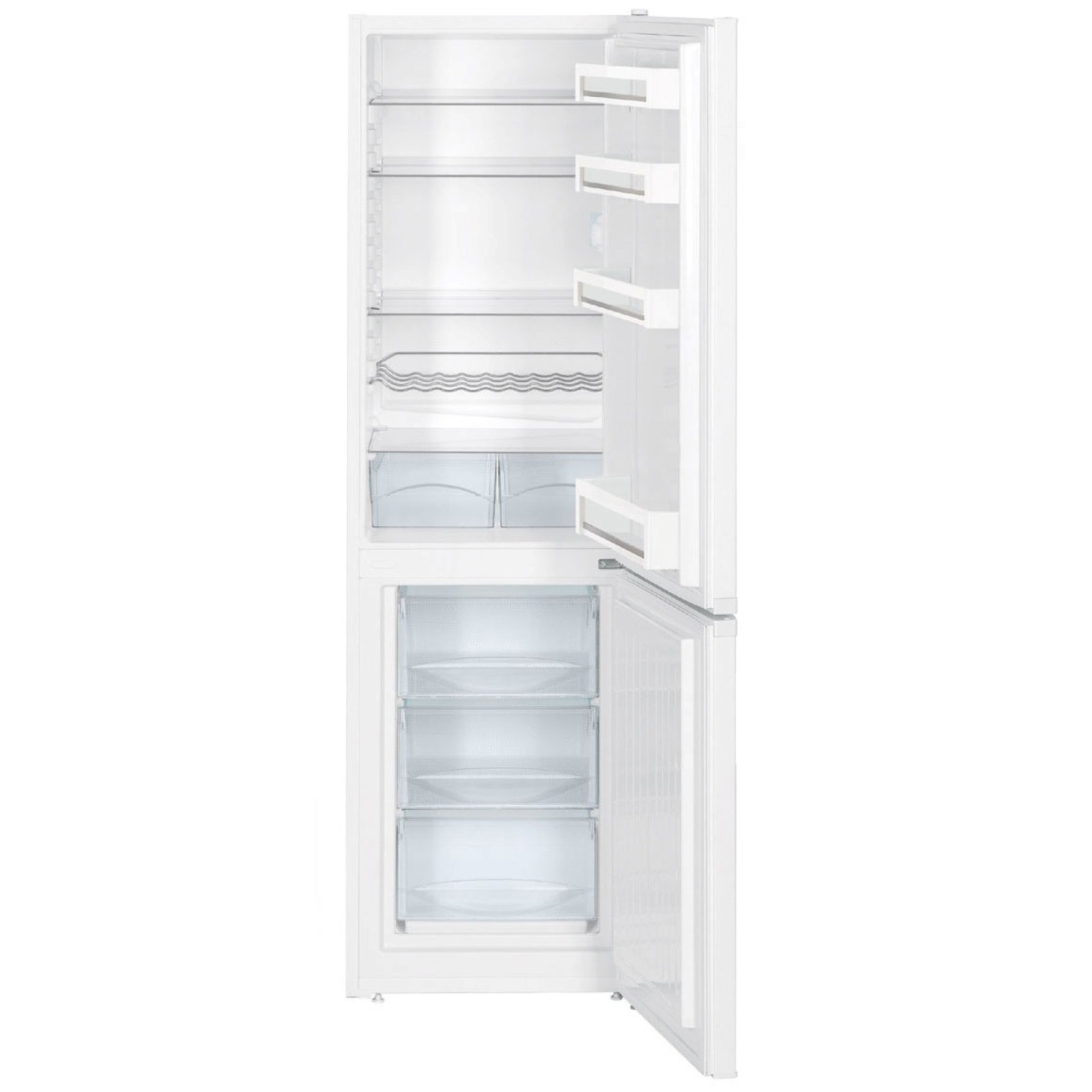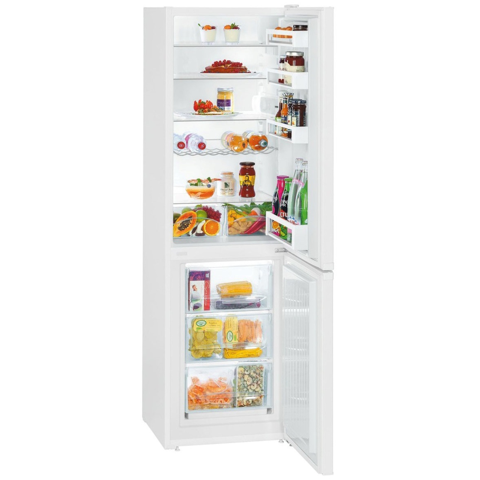 Interiorul frigiderului a fost atent proiectat până la ultimul detaliu. Dispune de patru rafturi din sticlă securizată, dintre care trei sunt reglabile pe înălțime. De asemenea, dispune de două cutii pentru fructe și legume, un raft universal pentru sticle și patru rafturi din plastic pe ușă. Sunt incluse și compartimente suplimentare pentru sticle, conserve și o cutie pentru ouă. Congelatorul este situat în partea de jos și este echipat cu sistemul SmartFrost pentru o răcire eficientă. Dispune de trei sertare din sticlă, o tavă pentru cuburi de gheață și sistemele FrostSafe și VarioSpace pentru depozitarea convenabilă a alimentelor. Frigiderul este controlat de un control rotativ mecanic situat în interiorul frigiderului, asigurând ușurință și confort. Consumul anual de energie este de doar 267 kWh, ceea ce vă economisește bani la facturile de energie.