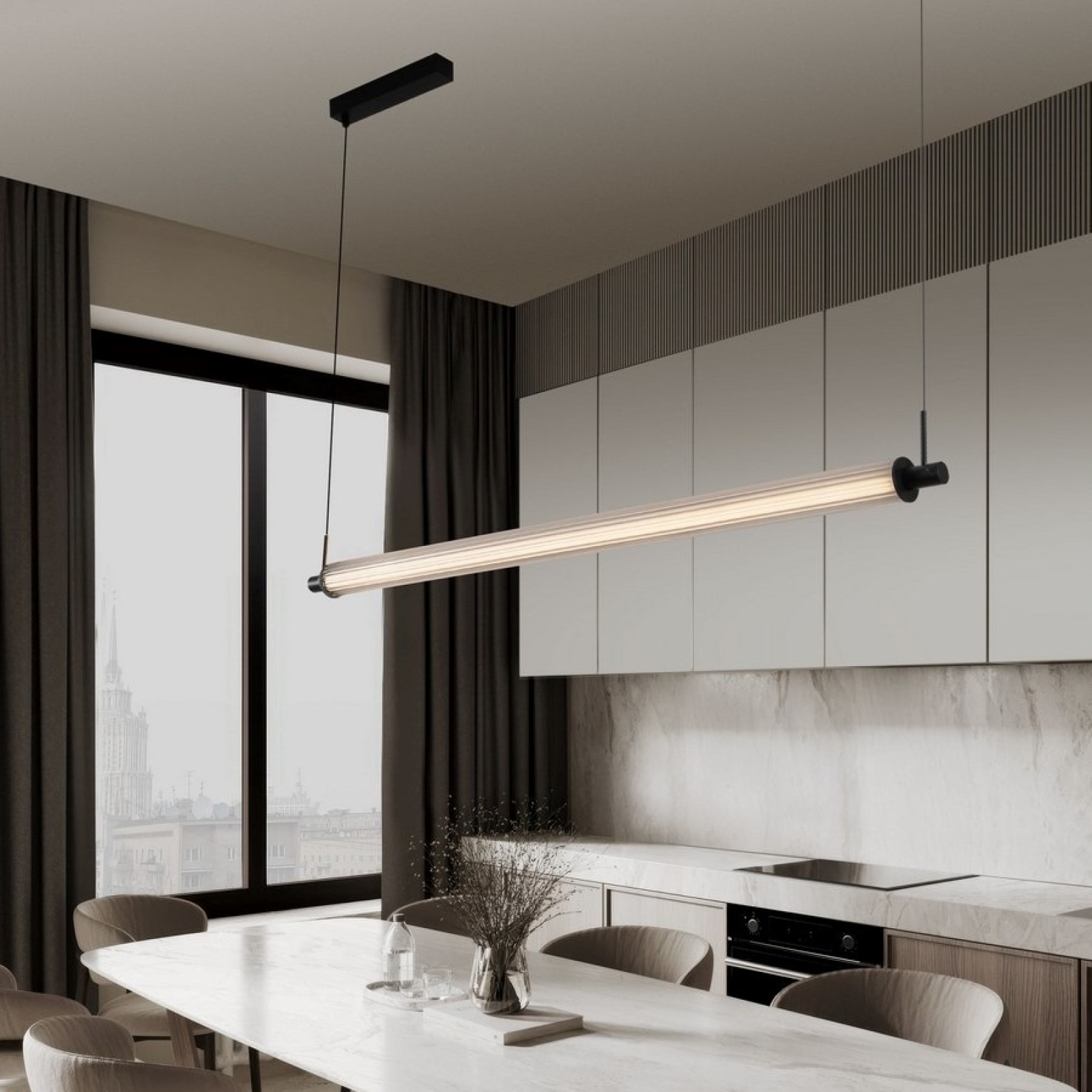 Suspensie moderna pentru interior Glovia 9088204, cu structură din aluminiu și metal vopsită negru mat si dispersor dublu din sticla transparenta la exterior si acril alb opal la interior. Echipată cu LED-uri SMD CCT 27W, cu posibilitate de controlare a temperaturii de culoare de la alb cald 2700K la alb cald 3000K. Temperatura de culoare se poate seta înainte de instalare, prin intermediul comutatorului integrat în baza corpului de iluminat. Flux luminos maxim 1890 lumeni.