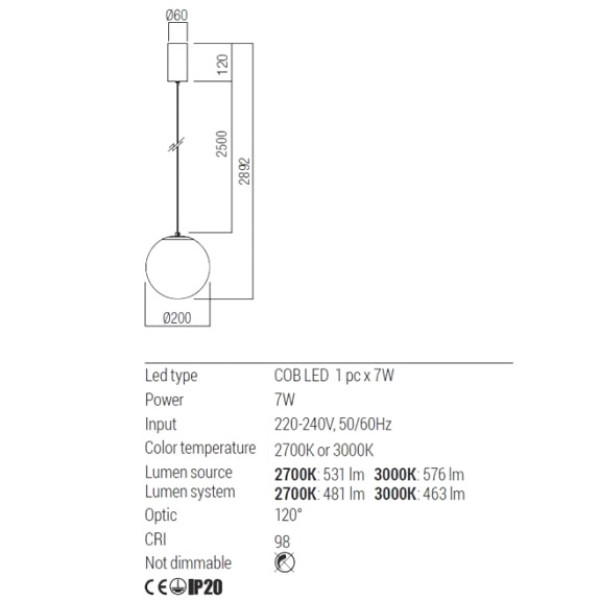 Echipată cu un LED COB 7W cu temperatura de culoare alb cald 3000K / 2700K.