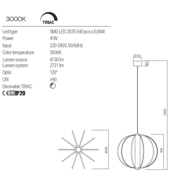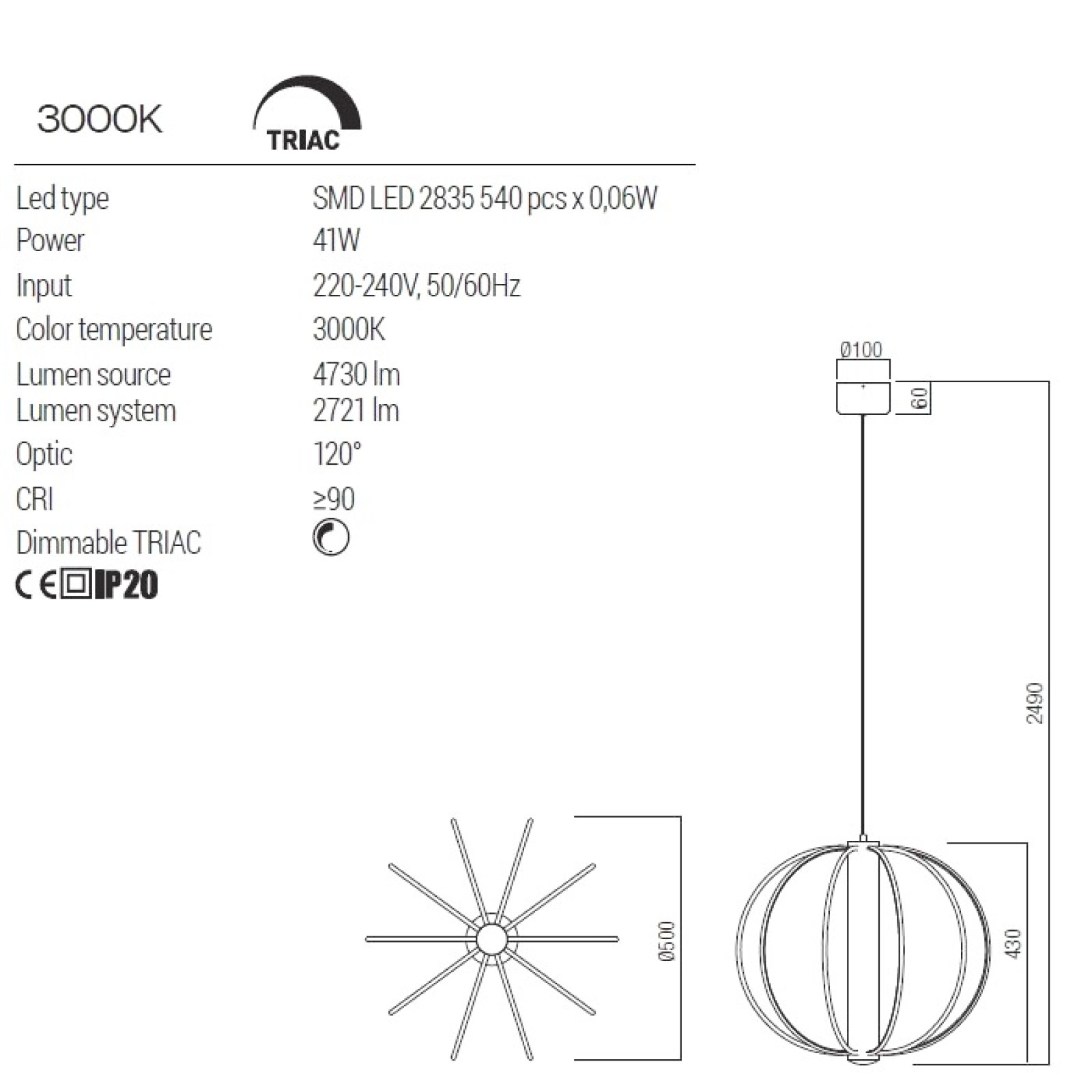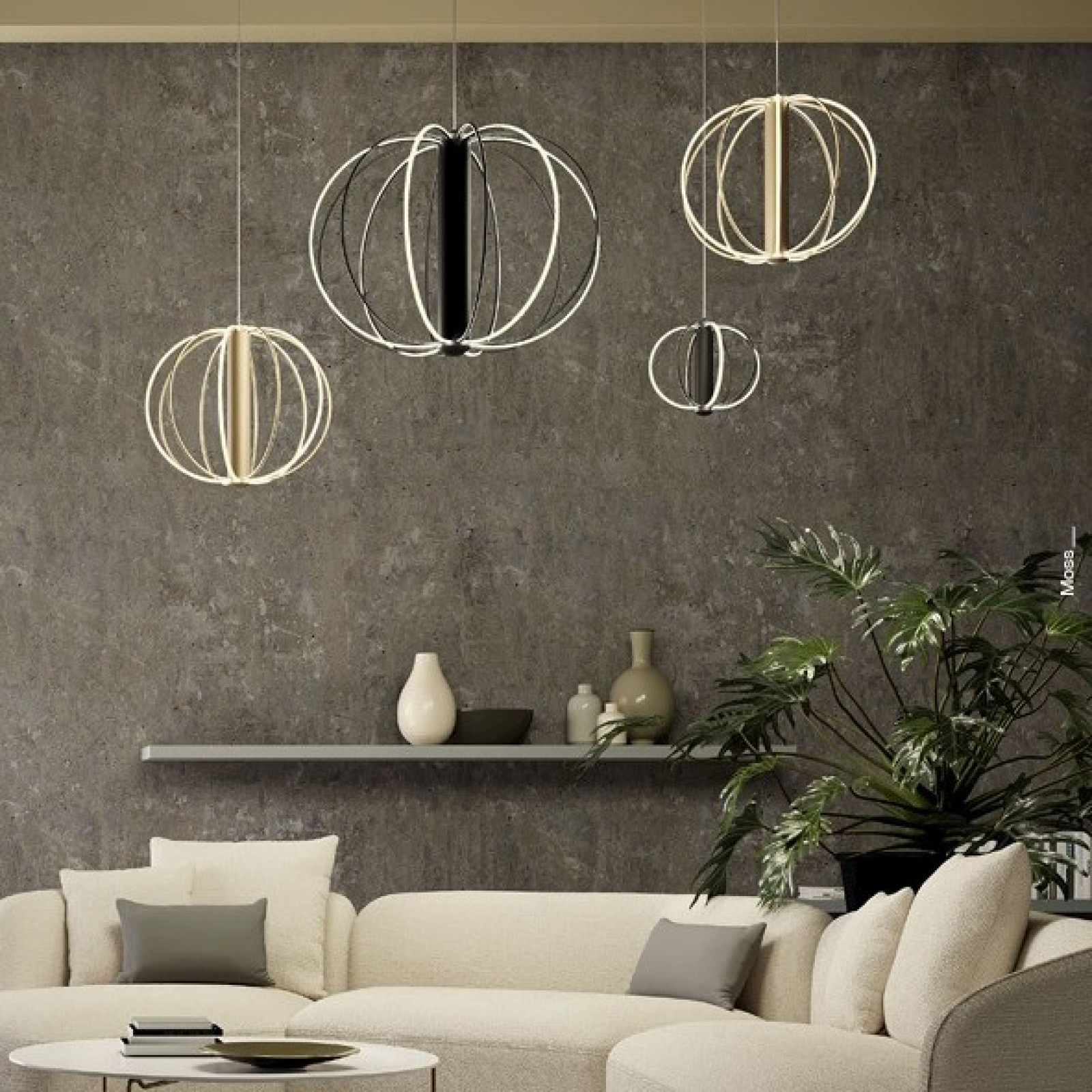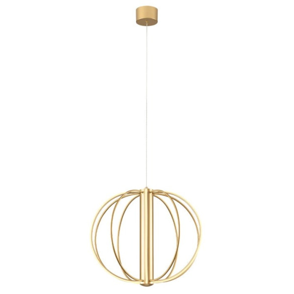 Suspensie moderna pentru interior Redo Group Moss 01-4429, dimabila, cu structură din aluminiu și metal vopsit în câmp electrostatic auriu mat si dispersor din silicon alb opal. Echipata cu LED-uri SMD 41W cu temperatura de culoare alb cald 3000K. Total flux luminos 2721 lumeni.