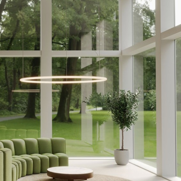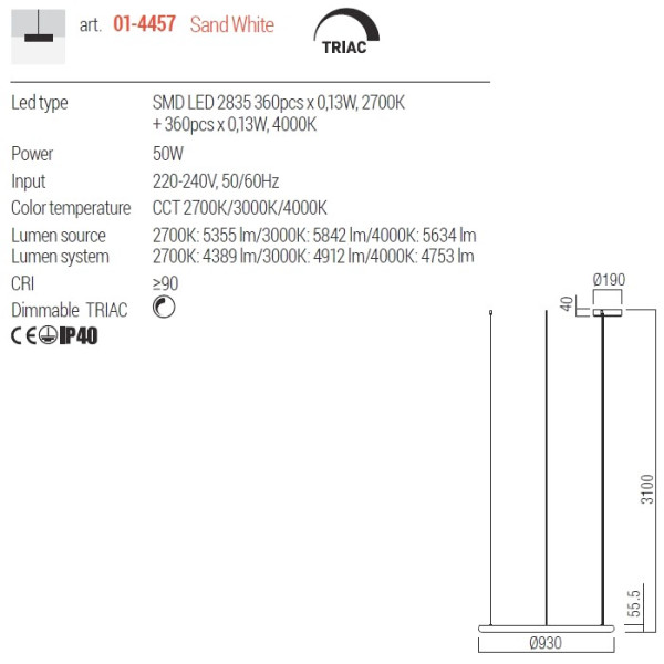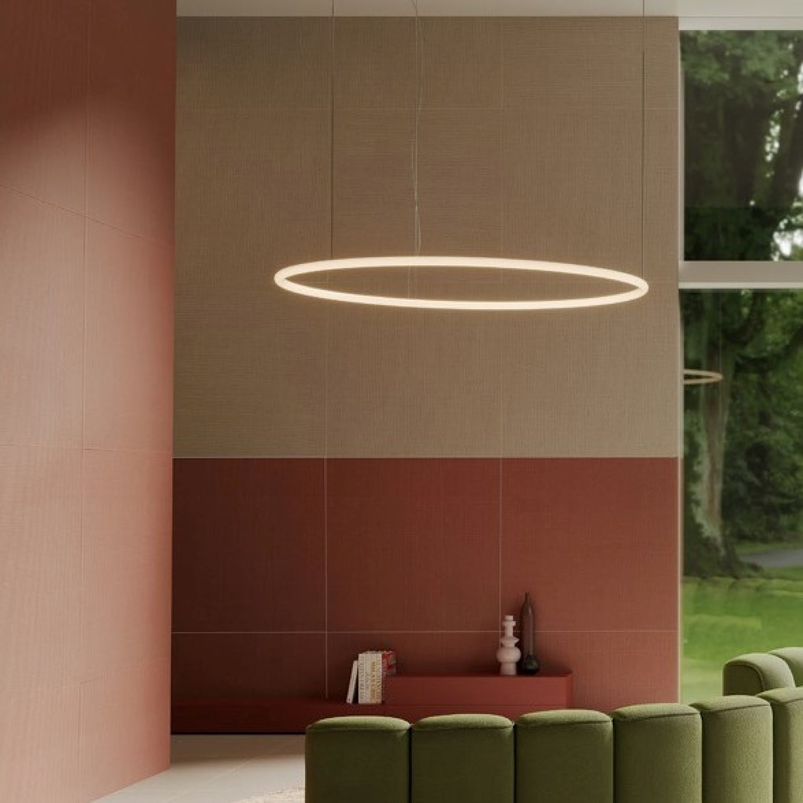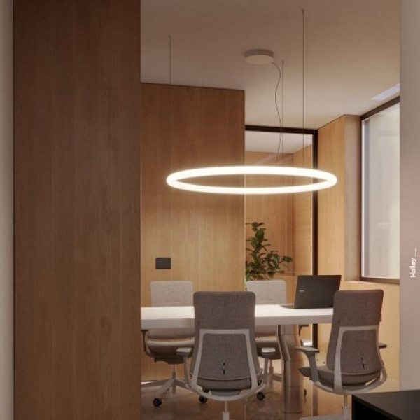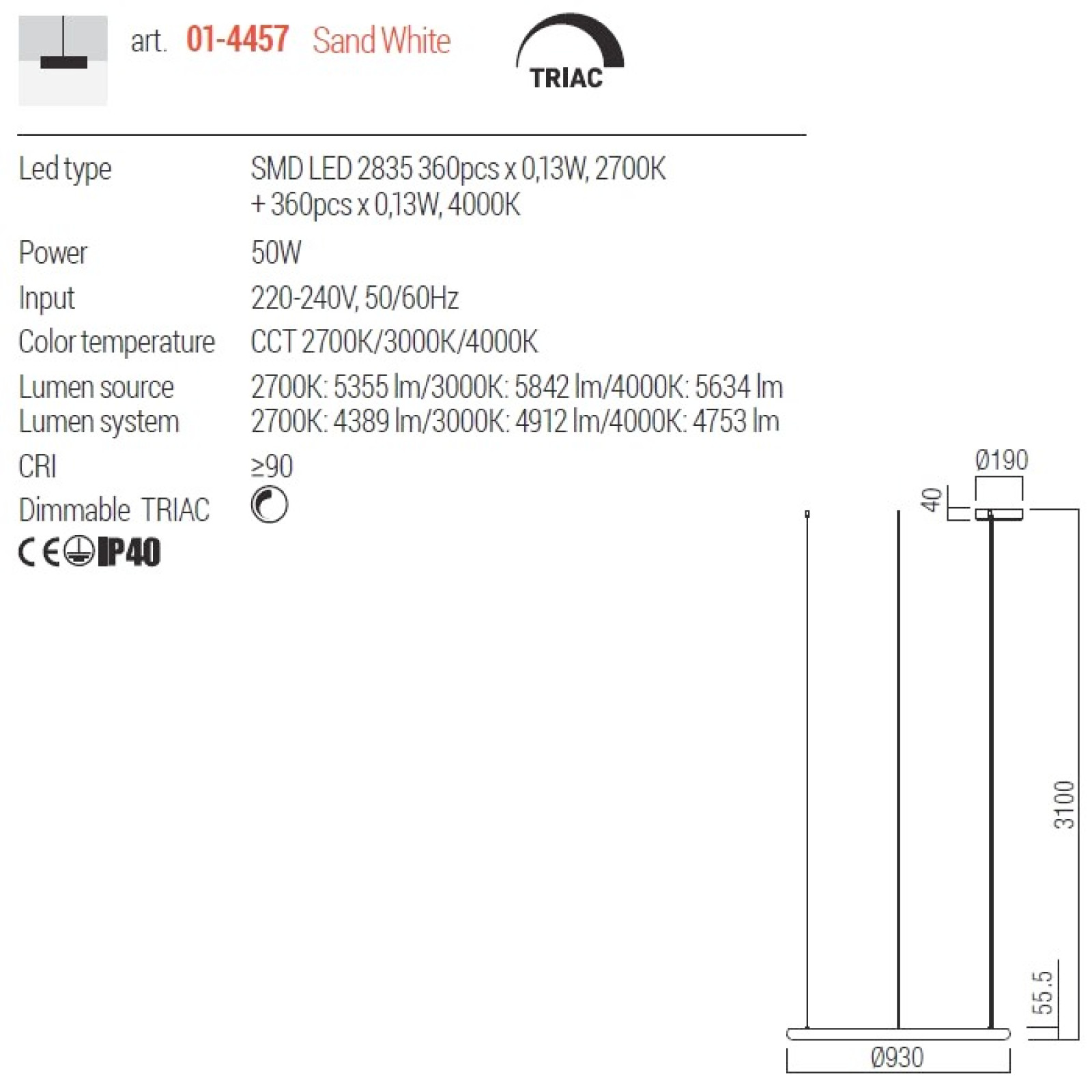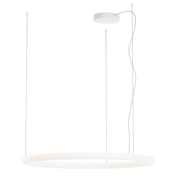 Suspensie moderna pentru interior Redo Group Halley 01-4457 cu structură din metal vopsită alb mat si dispersor acril alb opal. Echipata cu LED-uri SMD 50W, cu posibilitatea de schimbare a temperaturii de culoare 2700K, 3000K și 4000K. Flux luminos maxim 4912 lumeni.