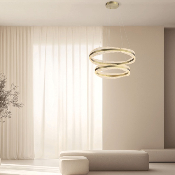 Suspensie Zambelis 25413 combină forma arhitecturală cu eleganța. Fabricată din metal și cristal, cu un finisaj auriu pal. Puterea sa de 118 wați, lumina caldă de 3000K și luminozitatea de 7400 lm cu un CRI de 90 oferă o strălucire puternică și naturală. Funcția de reglare Triac permite controlul complet asupra fluxului luminos.