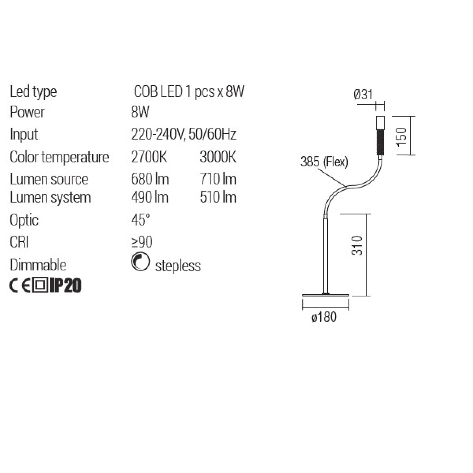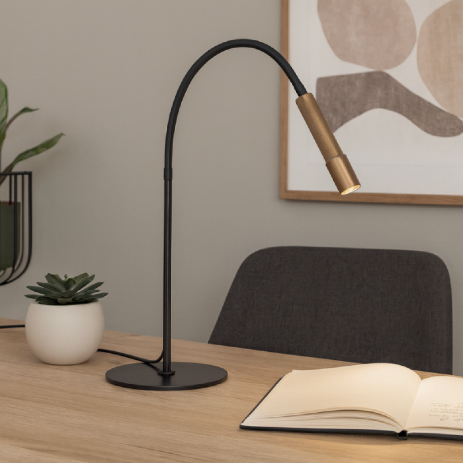 Veioza moderna pentru interior Redo Group Drill 01-4719 cu brat flexibil, cu structură din metal și aluminiu vopsit negru mat si bronz antic si dispersor din acril transparent. Echipata cu LED COB 8W cu temperatura de culoare alb cald 3000K. Total flux luminos 510 lumeni.