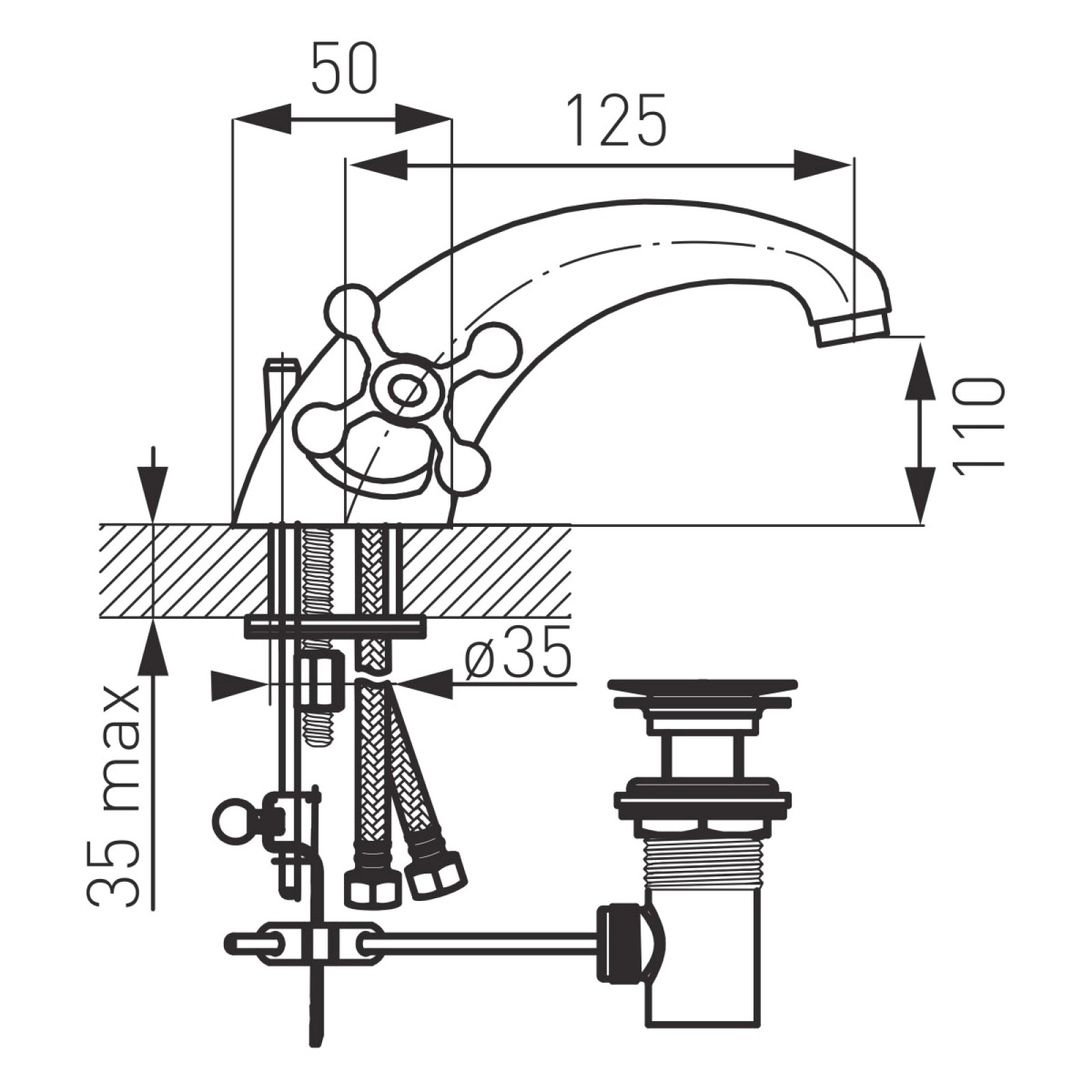 Robinetul pentru chiuvetă Ferro Retro New XD2 cu două supape în design retro este conceput pentru a fi utilizat în băi pentru furnizarea de apă caldă și rece. Există un dop de scurgere automat Clik-clak G1/4 metalic. Modelul este echipat cu un cartus ceramic, (inlocuibil). Robinetul pentru lavoar este realizat din alamă cromată de înaltă calitate, care este puternică, durabilă și rezistentă la temperaturi extreme. Diametru gaura de montare 35 mm. Aerator FerroAirMix M24x1. Racorduri flexibile (furtunuri) G 3/8 - M10x1. Regulator de jet M24x1 instalat.