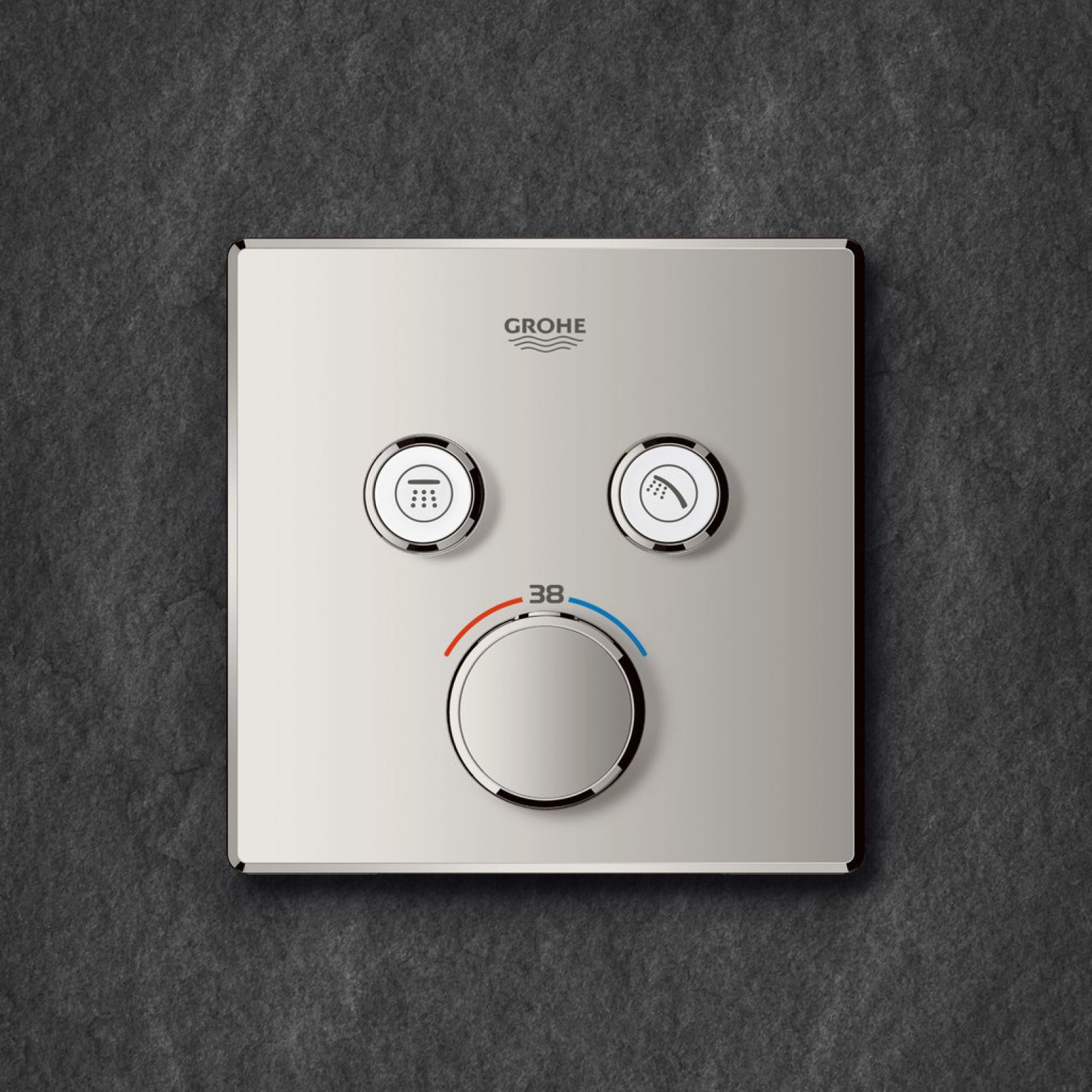 Bateria termostatică încorporată Grohe Grohtherm pentru duș și cadă dispune de un derivator cu două căi și un cartuș termoelement din ceară. Butonul Grohe SafeStop vă permite să setați temperatura maximă la 38°C pentru a preveni opărirea. Limitatorul de temperatură opțional GROHE SafeStop Plus vă permite, de asemenea, să adăugați o limită suplimentară de 43°C pentru un nivel suplimentar de siguranță. Dispune de o supapă de sens unic încorporată și un filtru de murdărie. Debitul de apă la ieșirea B = 24 l/min, ieșirea C = 26 l/min, ieșirea B + C = 29 l/min. Utilizarea simultană a mai multor consumatori.