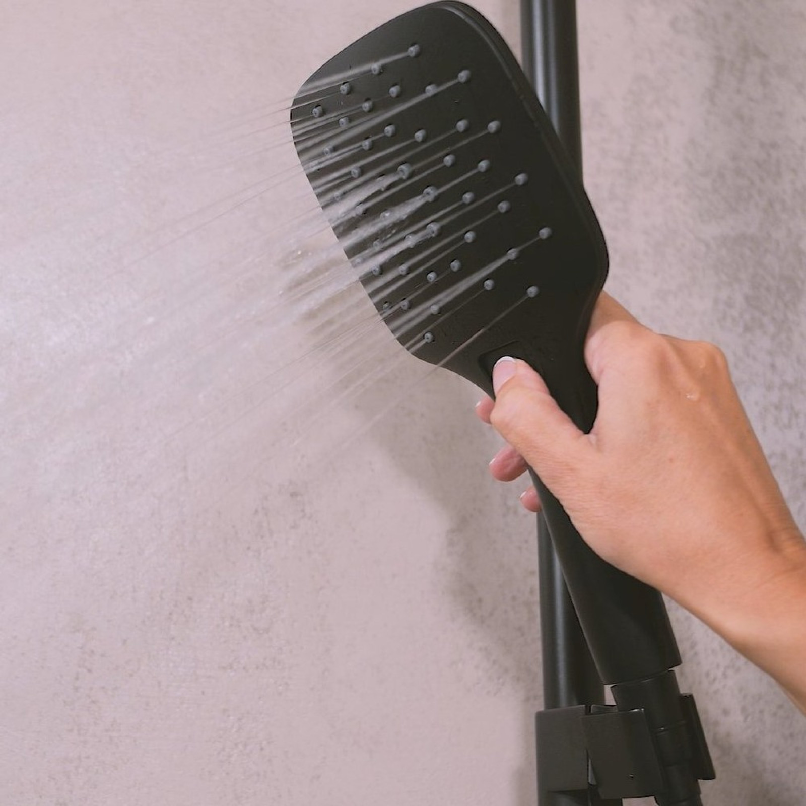 Duș fix pătrat din ABS, 25 cm, pară de duș cu 3 funcții, dușul fix este rotativ lateral.