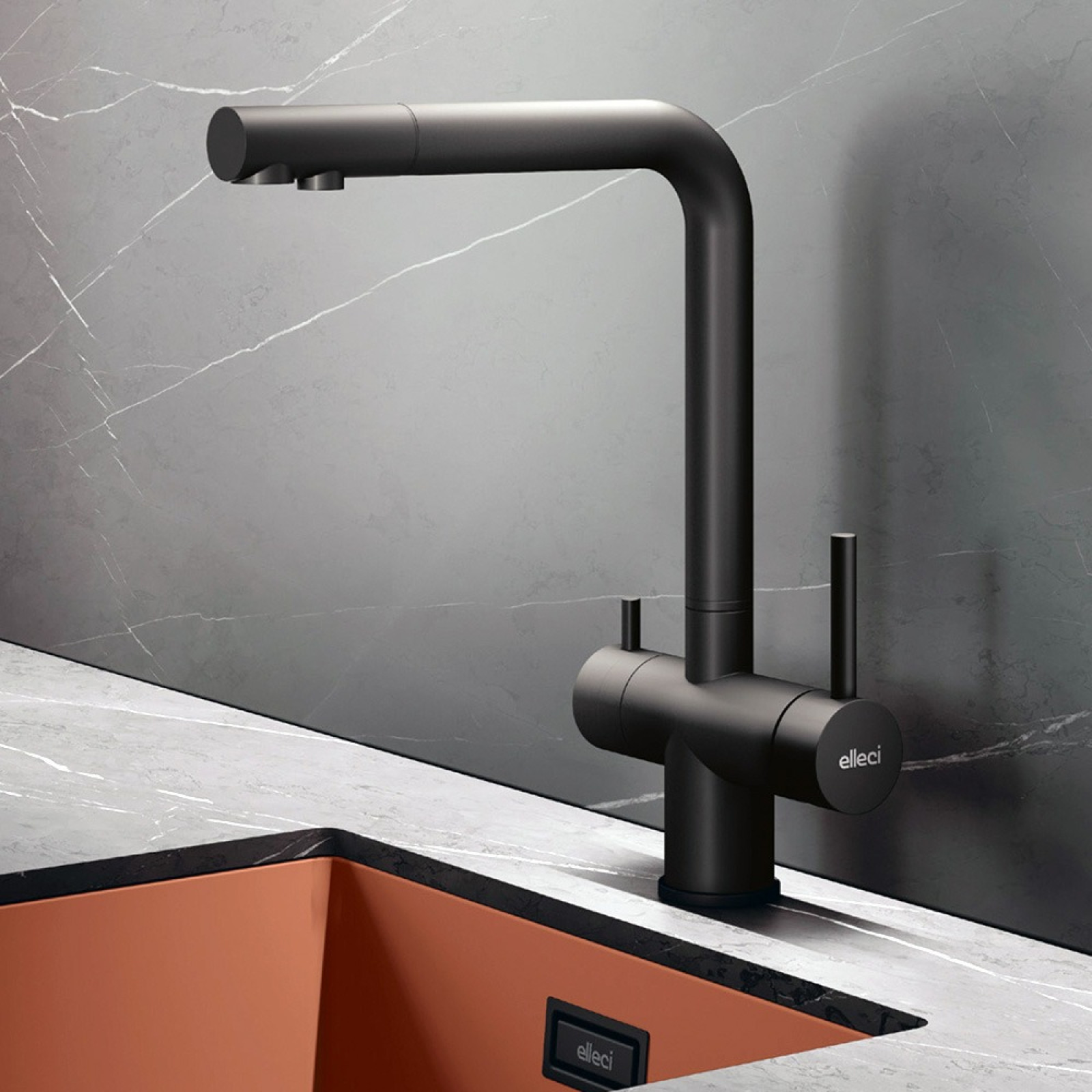 Baterie bucatarie Elleci Cross Pure Black cu pipa detasabila si canal suplimetar pentru conectare filtru de apa.