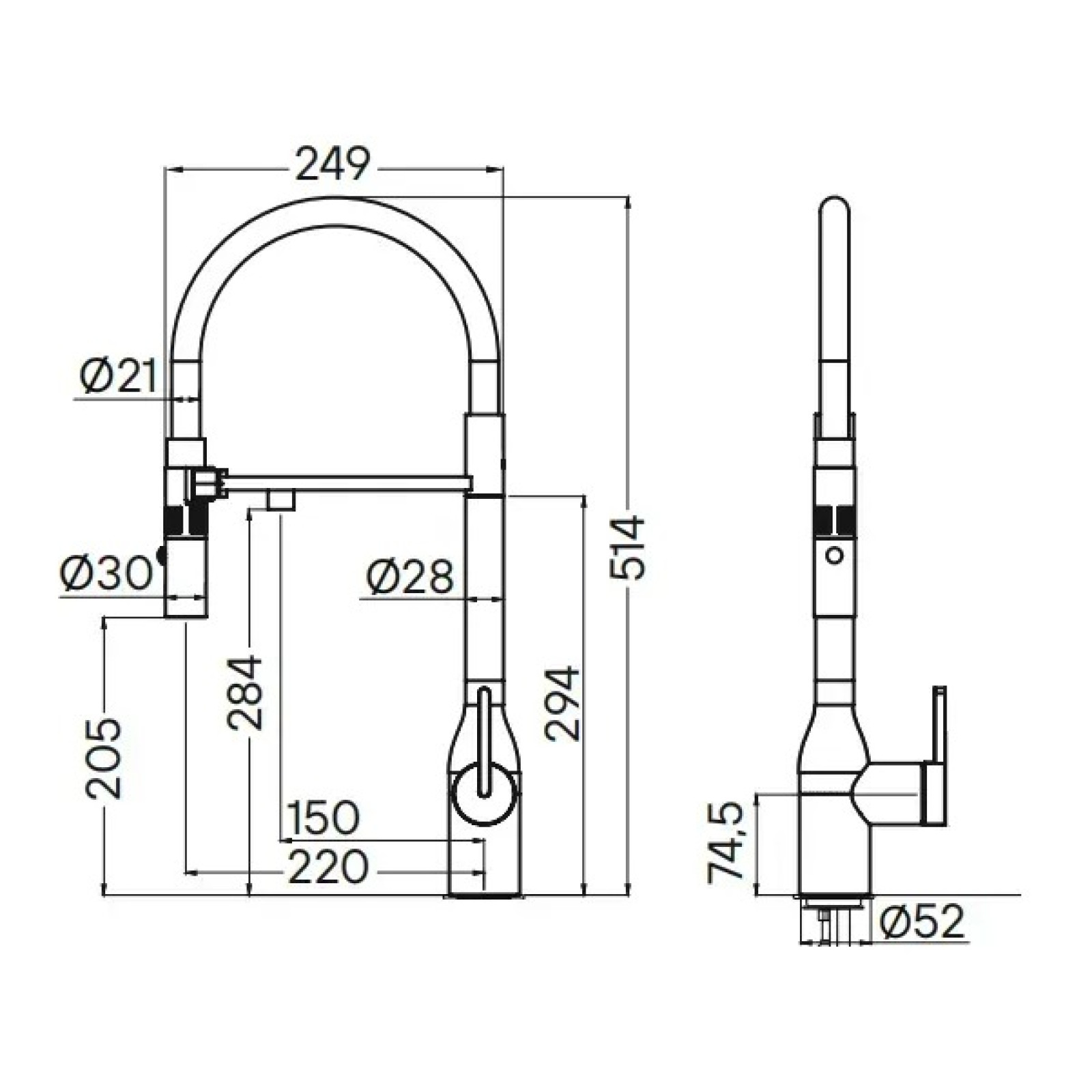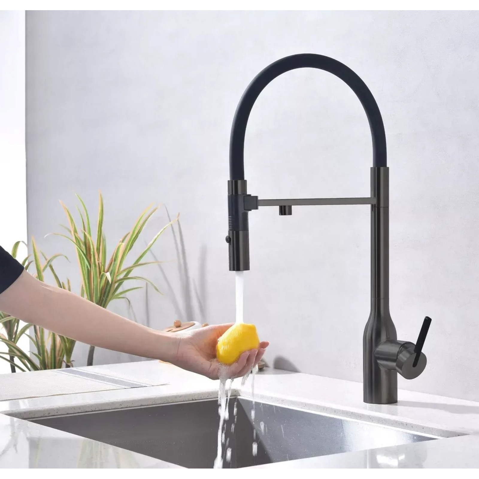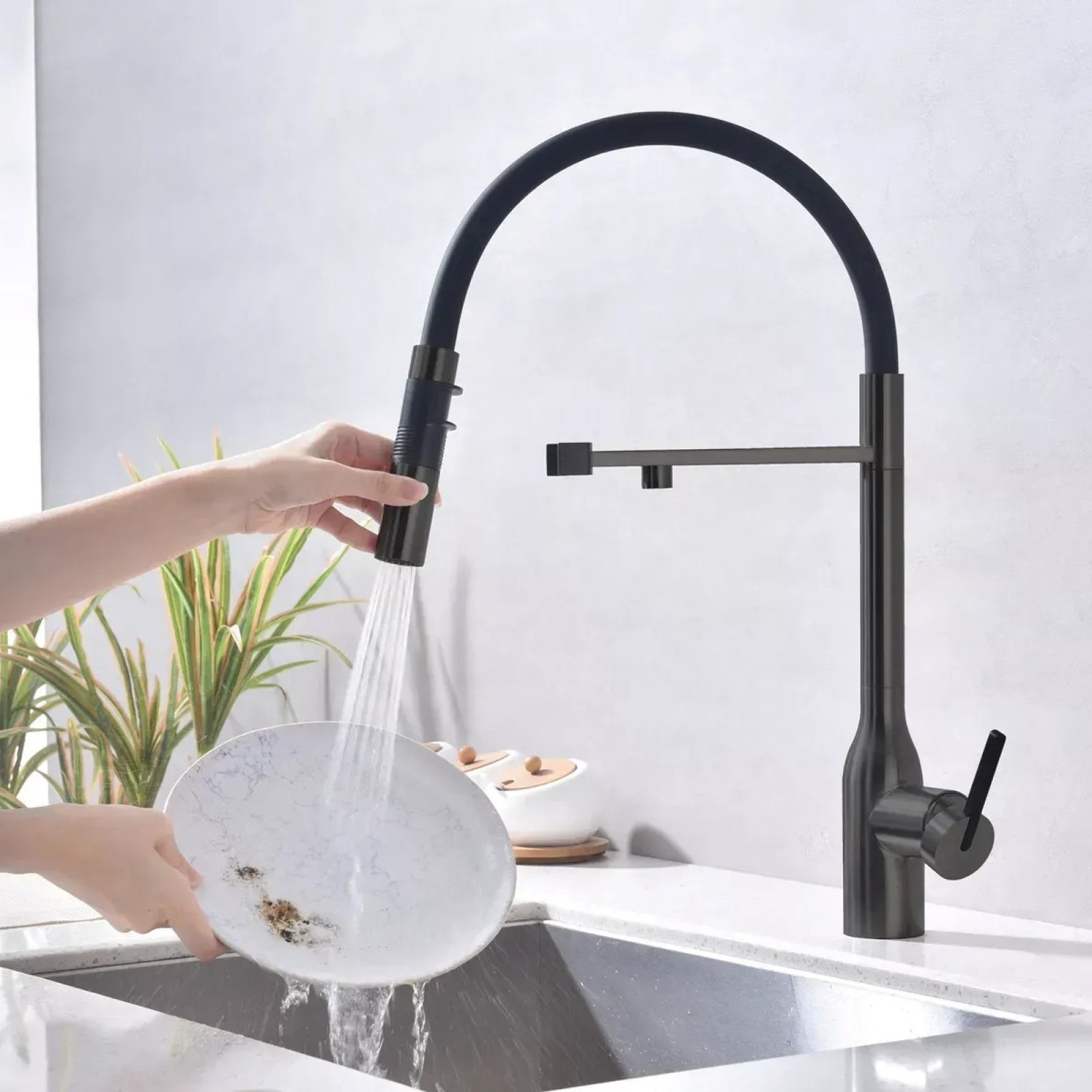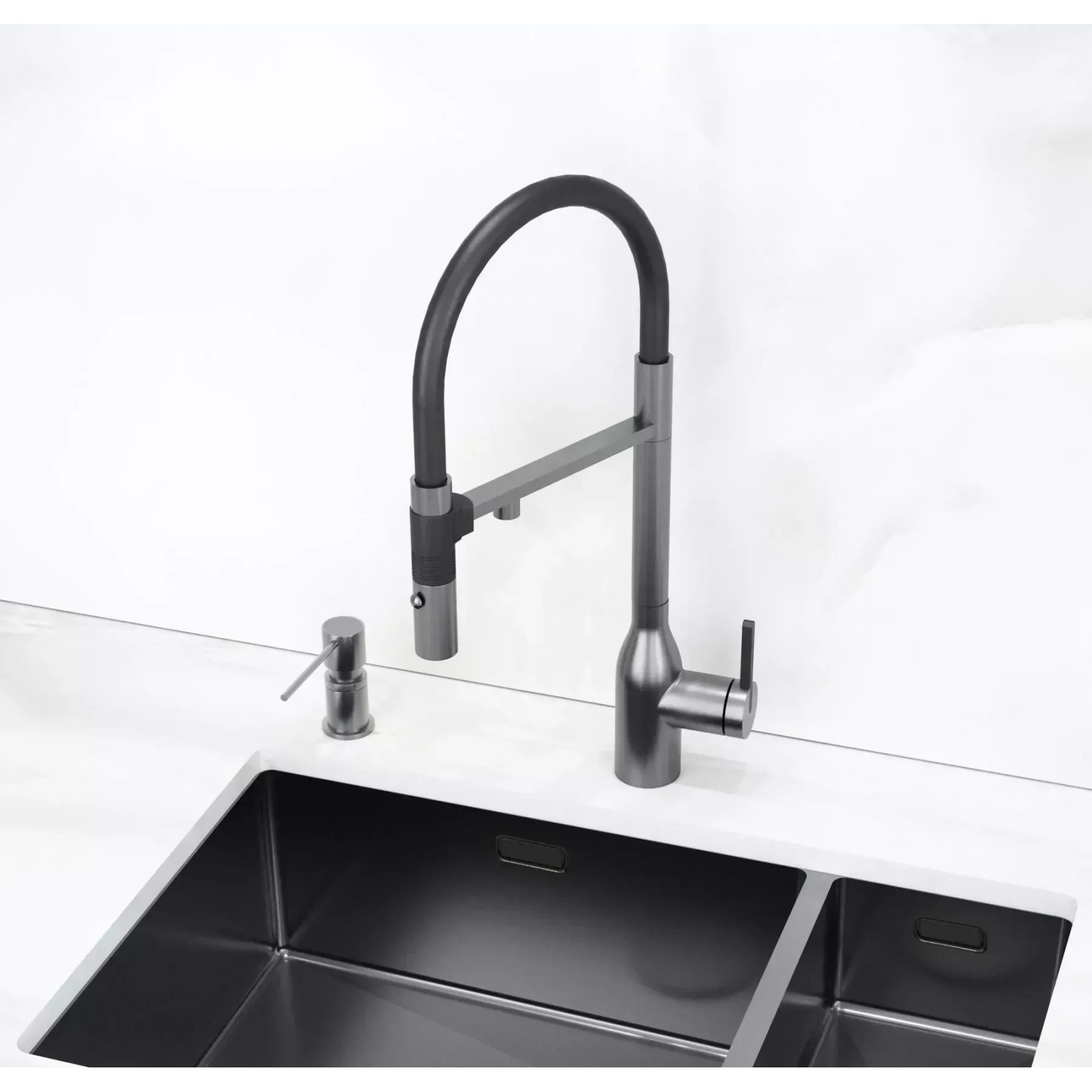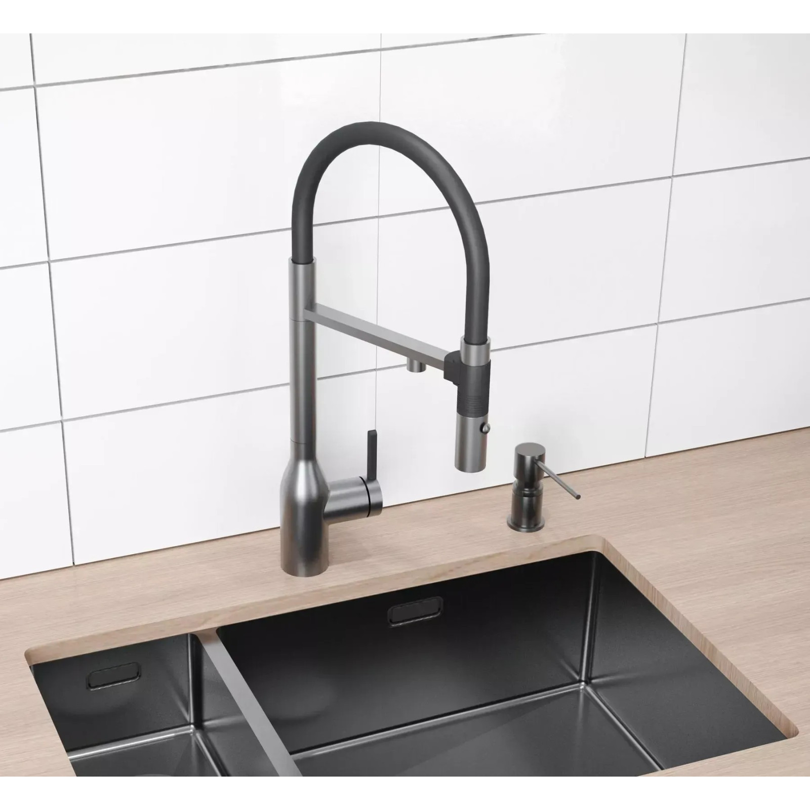 Bateria combinată de bucătărie Fabiano FKM 3129 Black Steel 3 in 1 cu gura de scurgere inalta intr-o carcasa din silicon. Racordarea apei calde, reci si a apei purificate de la filtru. Bateria dispune de o singură manetă de control cu un cartuș ceramic multifuncțional cu disc în trei poziții, care asigură o comutare precisă între modurile de debit al apei. De asemenea, este dotată cu un aerator din plastic NEOPERL 2 în 1, care economisește energie (mod pulverizare obișnuită sau duș). Furtunurile flexibile se extind pe o lungime de 50 cm. Gura pivotantă la 360° asigură poziționarea perfectă a jetului de apă în chiuvetă. Gaura de montare este de 35 mm.