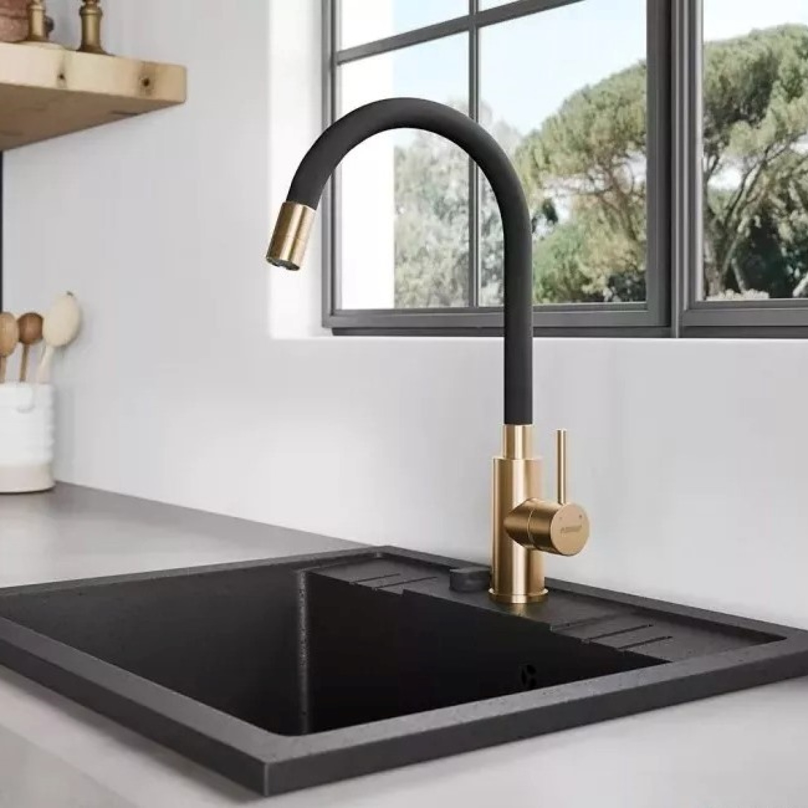 Baterie bucatarie Ferro Zumba BZA4BSSG cu pipa flexibilă și pivotantă din alama cu cartus ceramic si gura flexibila. Aerator M22x1. Racord flexibil G 3/8.