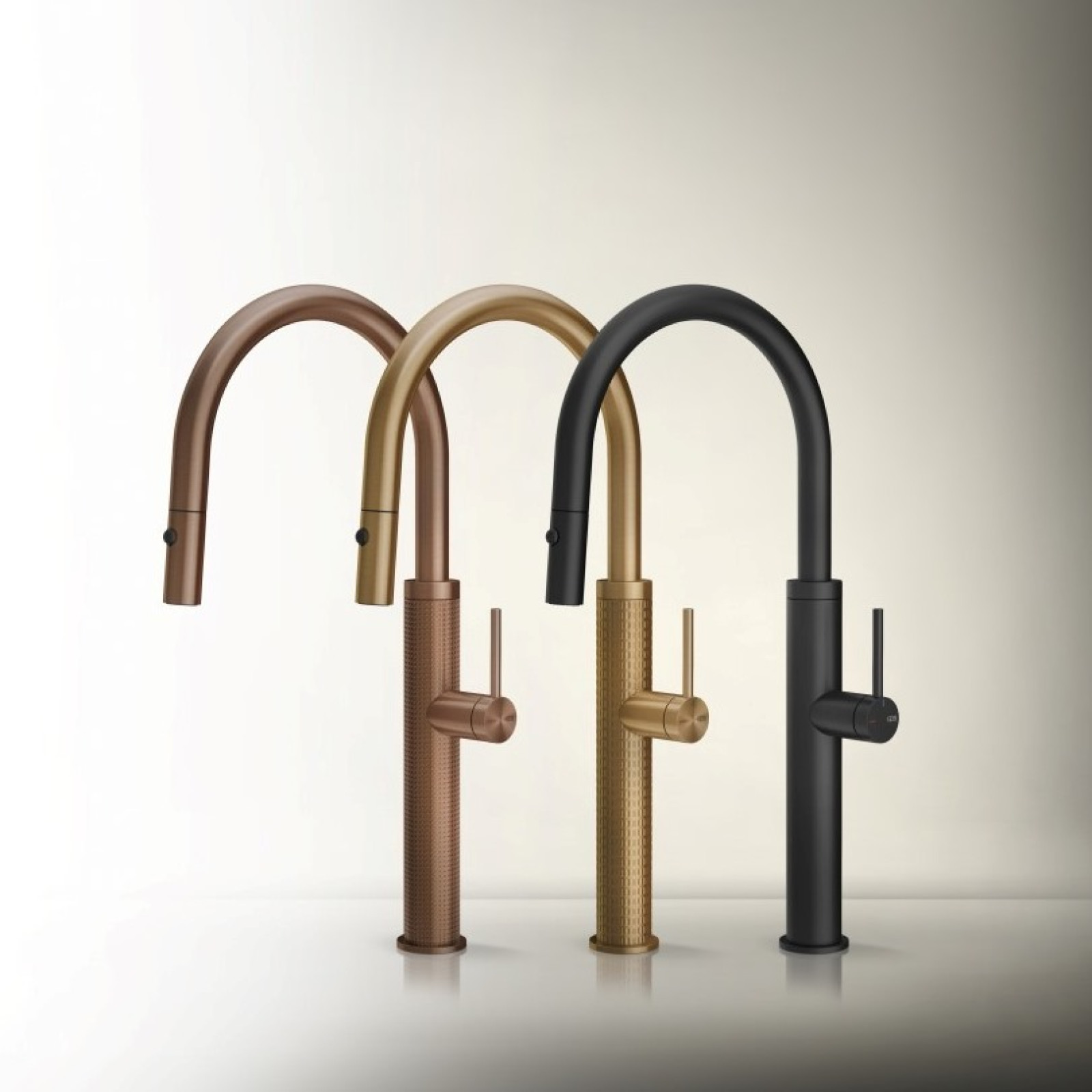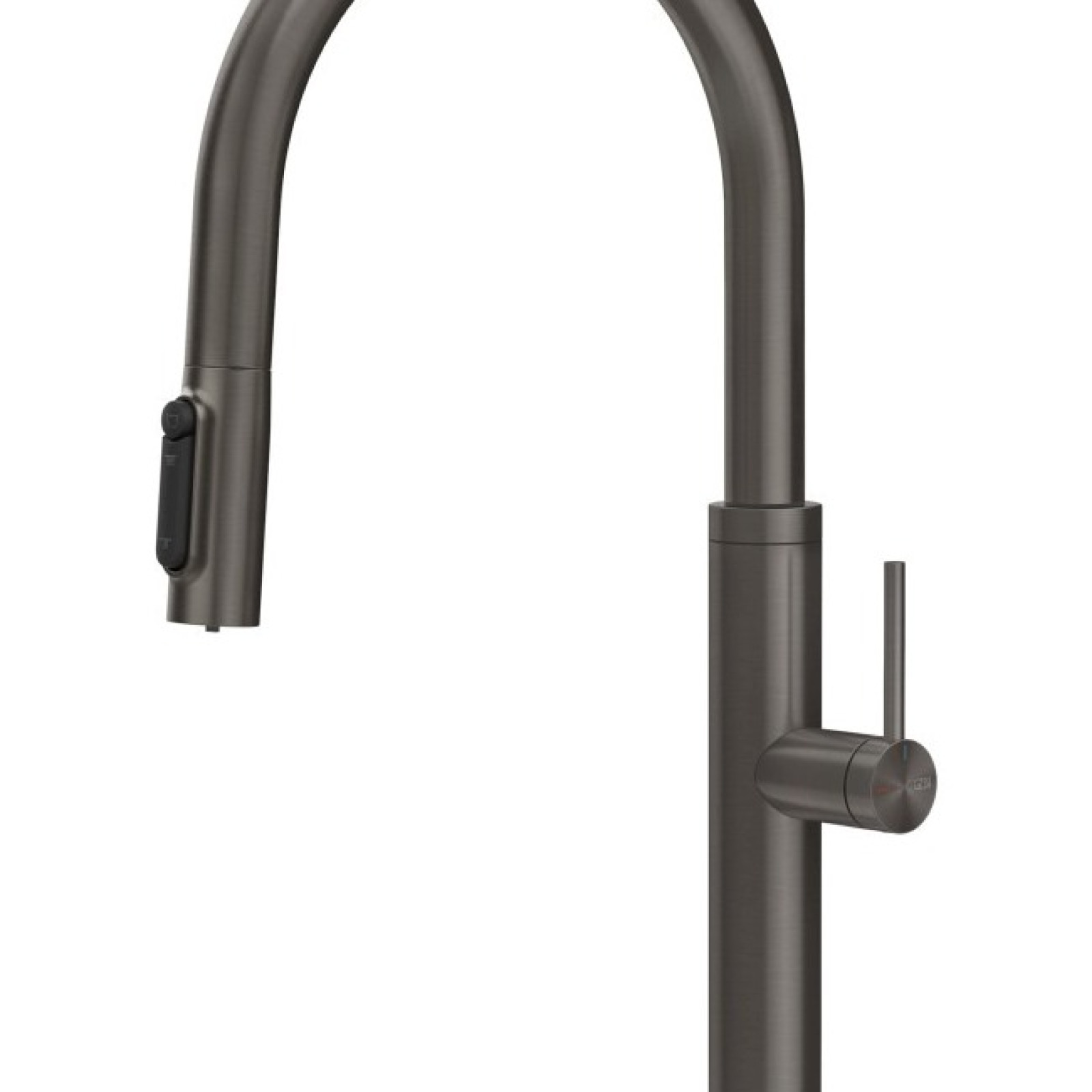 Baterie bucătărie Gessi Flessa 60822.707 cu pipă extractibilă și racord pentru apă filtrată. Manetă laterală de control. Cartuș ceramic. Pipa se rotește la 360°.