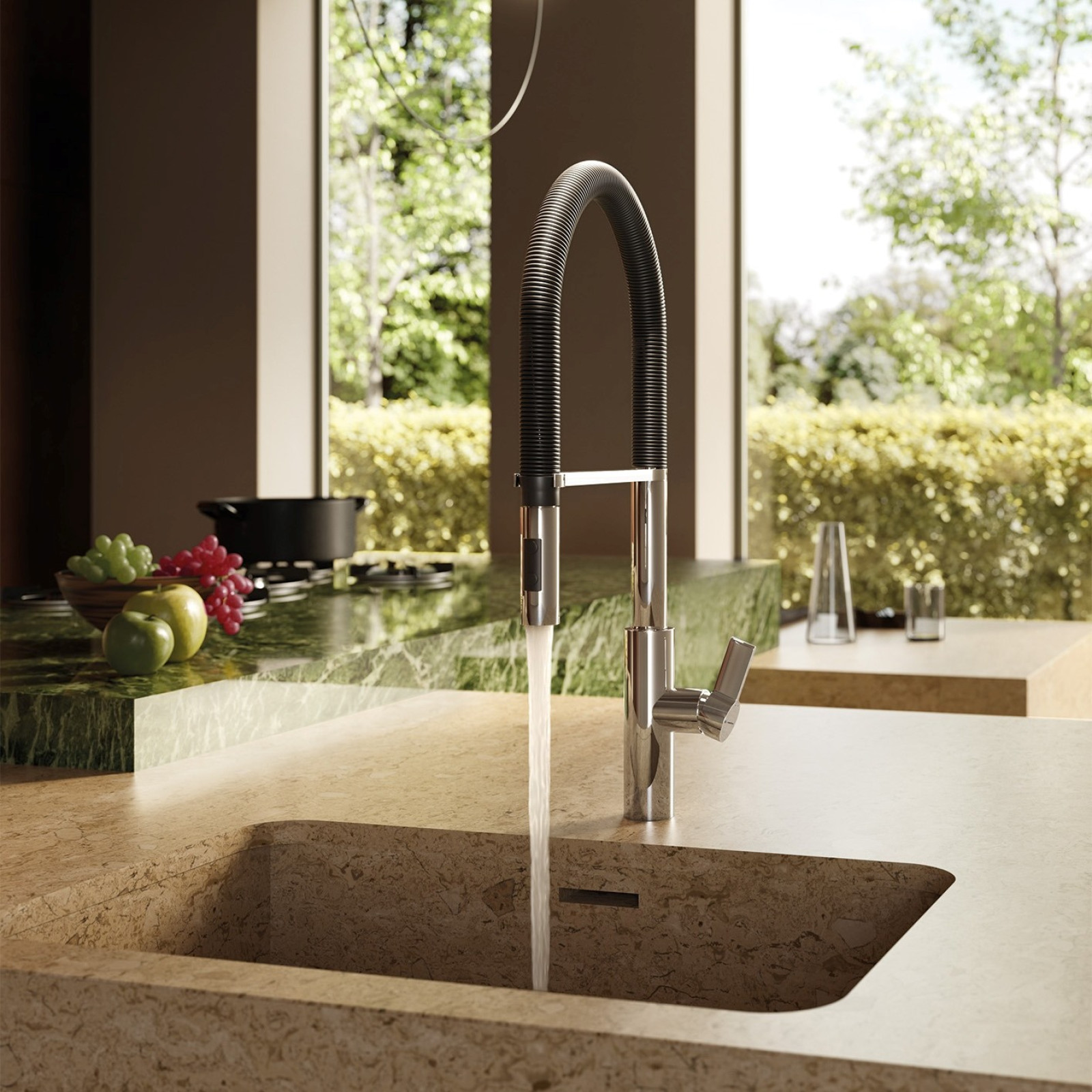Bateria de bucătărie Newform Libera are un gura de scurgere rotundă și rotativă. Cartușul ceramic oferă un control lin și precis al debitului de apă, garantând ani de funcționare fiabilă. Controlul cu o singură manetă permite reglarea rapidă și lină a debitului de apă cu o singură mână.