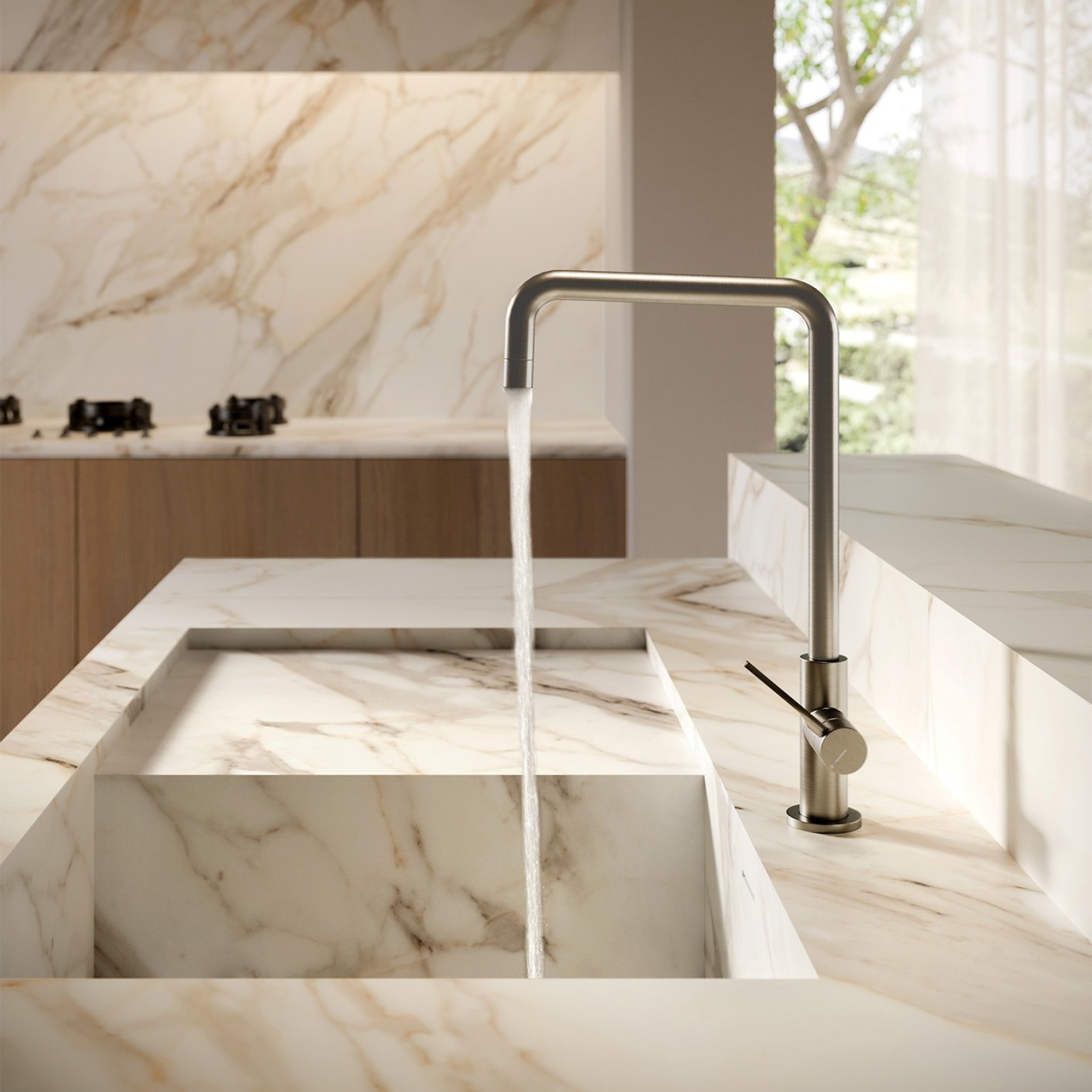 Bateria de bucătărie Newform Square are un gura de scurgere rotundă și rotativă. Cartușul ceramic oferă un control lin și precis al debitului de apă, garantând ani de funcționare fiabilă. Controlul cu o singură manetă permite reglarea rapidă și lină a debitului de apă cu o singură mână.