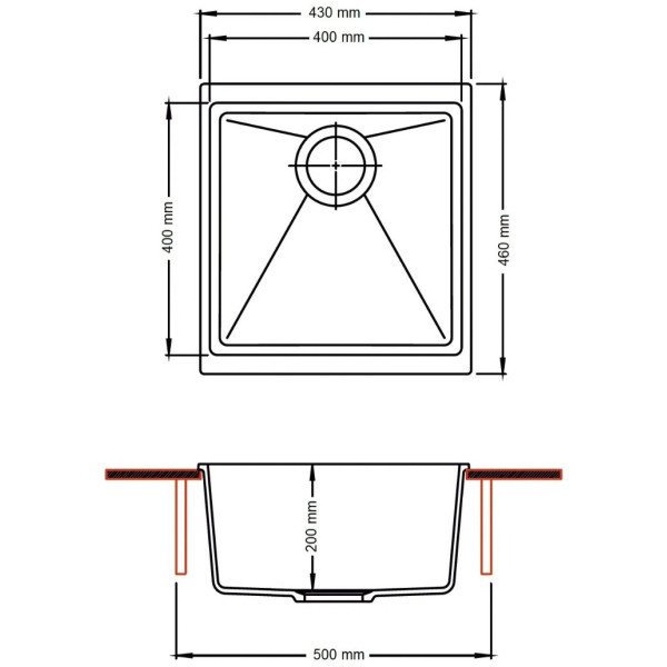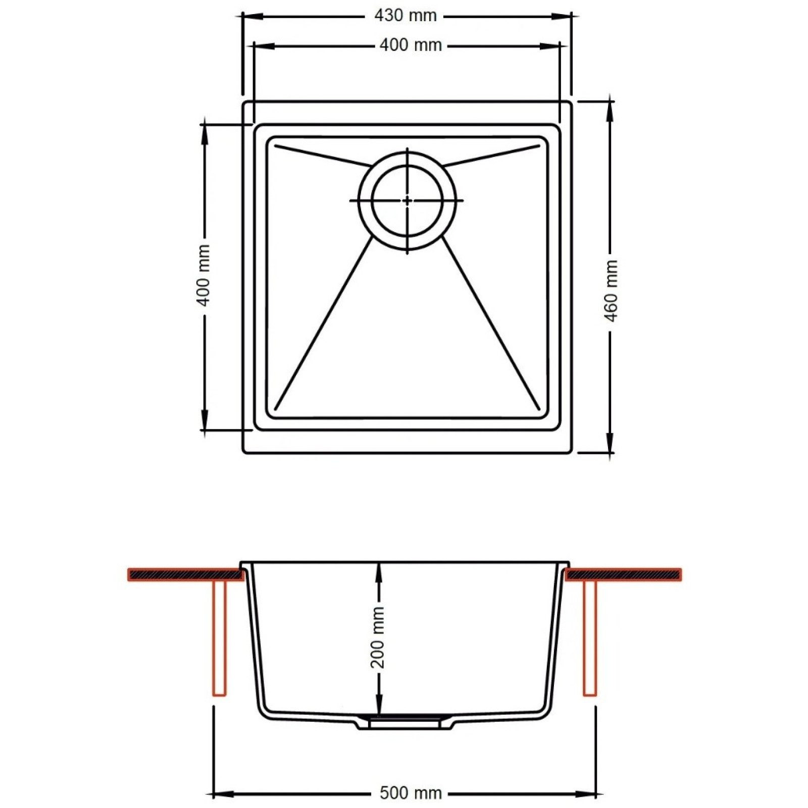 Dimensiuni chiuvetă: 430x460 mm. Cuvă: 400x400 mm. Adâncime cuvă: 200 mm.