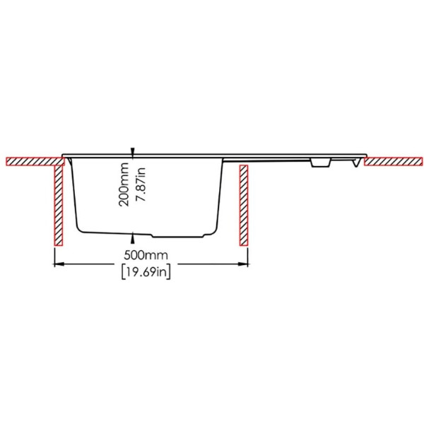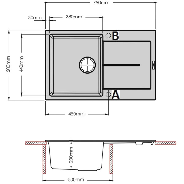 Chiuvetă de bucătărie dreptunghiulară Fabiano Navio 79x50 mm din granit, cu o cuvă și scurgător. Dimensiuni cuvă 380x430 mm. Adâncime cuvă 200 mm. Decupaj pentru instalare 750x460 mm.