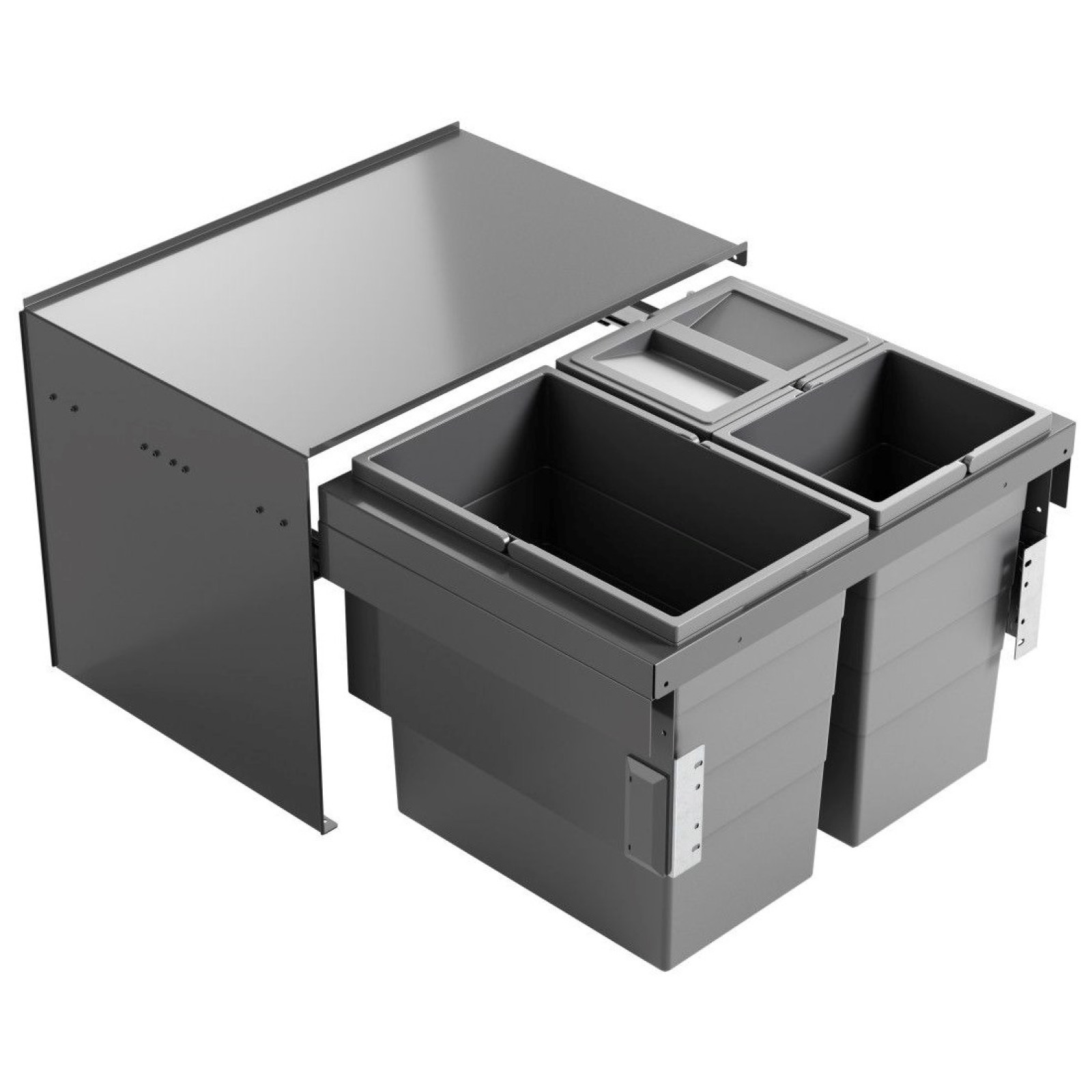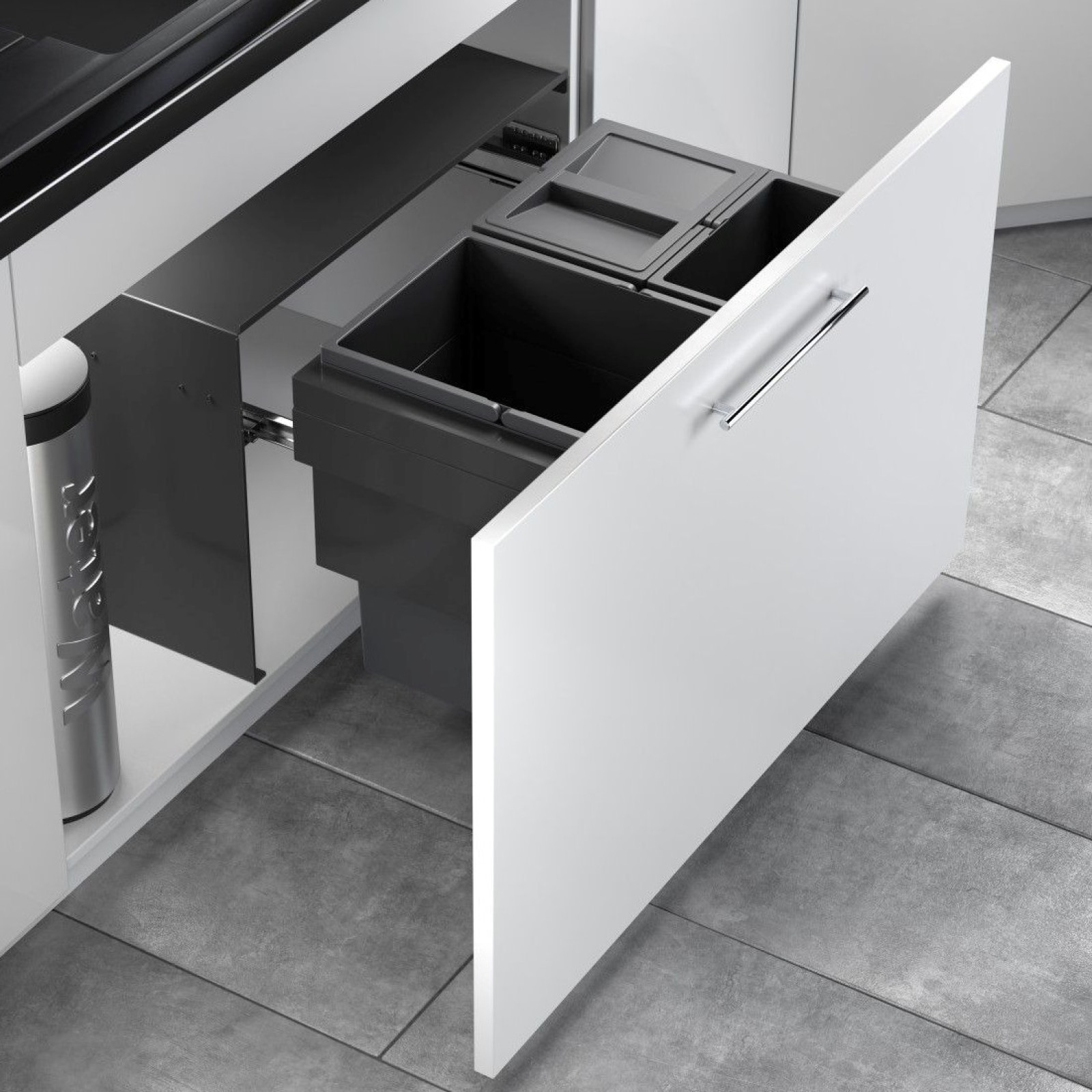 Cos de gunoi incorporat sub chiuveta Hailo AS Cargo Aqua 3608901, extensibil, cu o capacitate de 54 (1 x 28 + 2 x 13) de litri, este soluția ideală pentru cei care apreciază confortul și curățenia. Este dotat cu glisiere Smoth Tec cu închidere silențioasă.