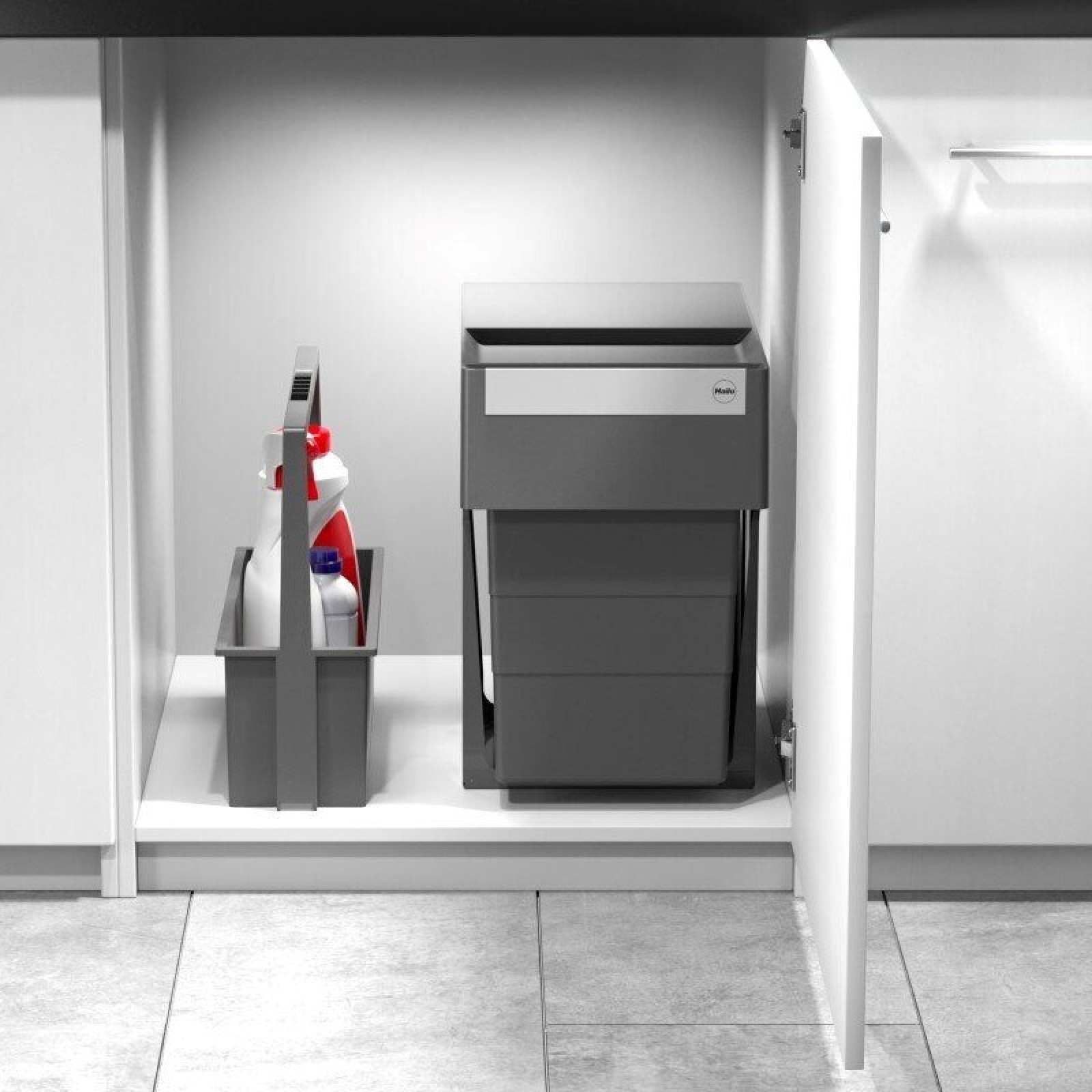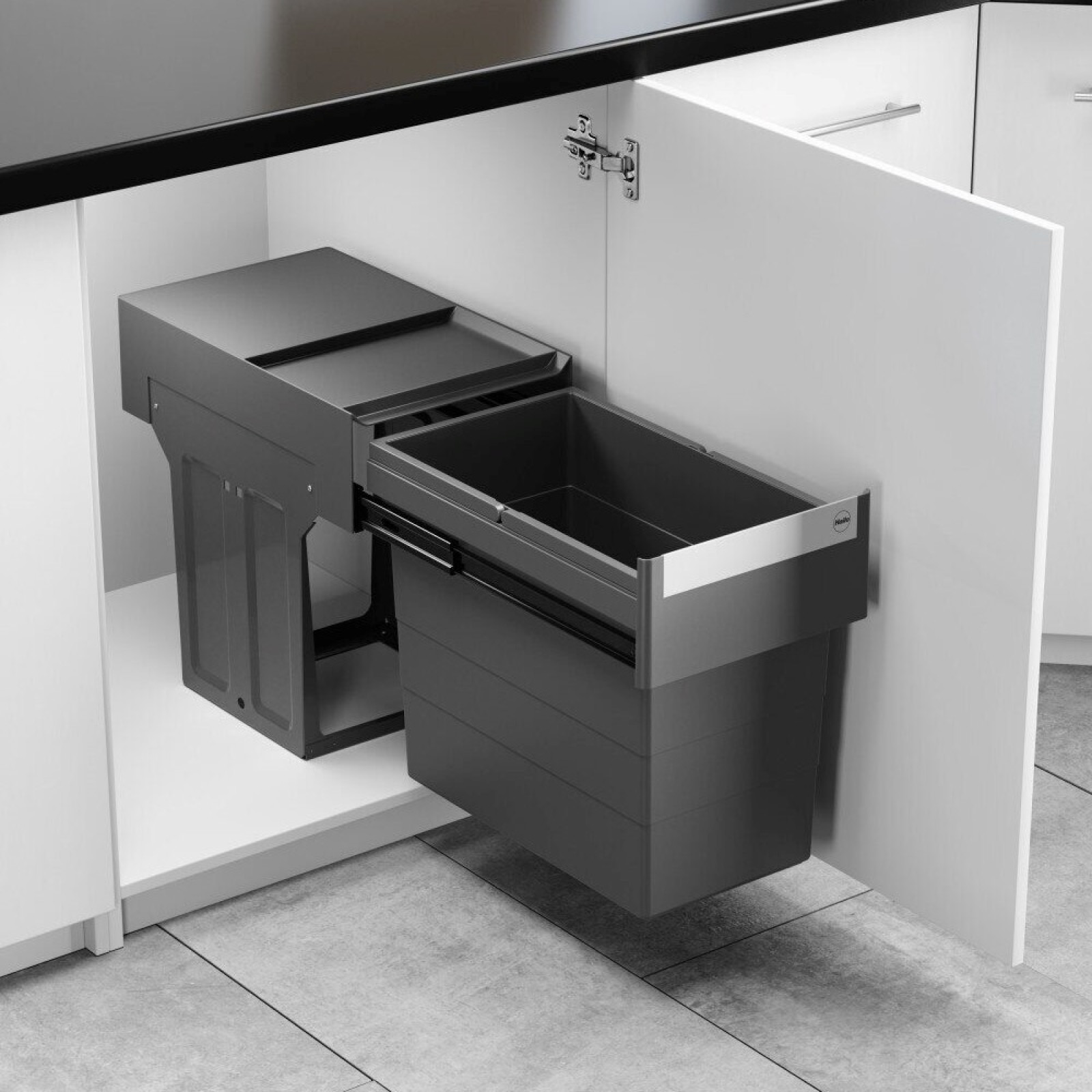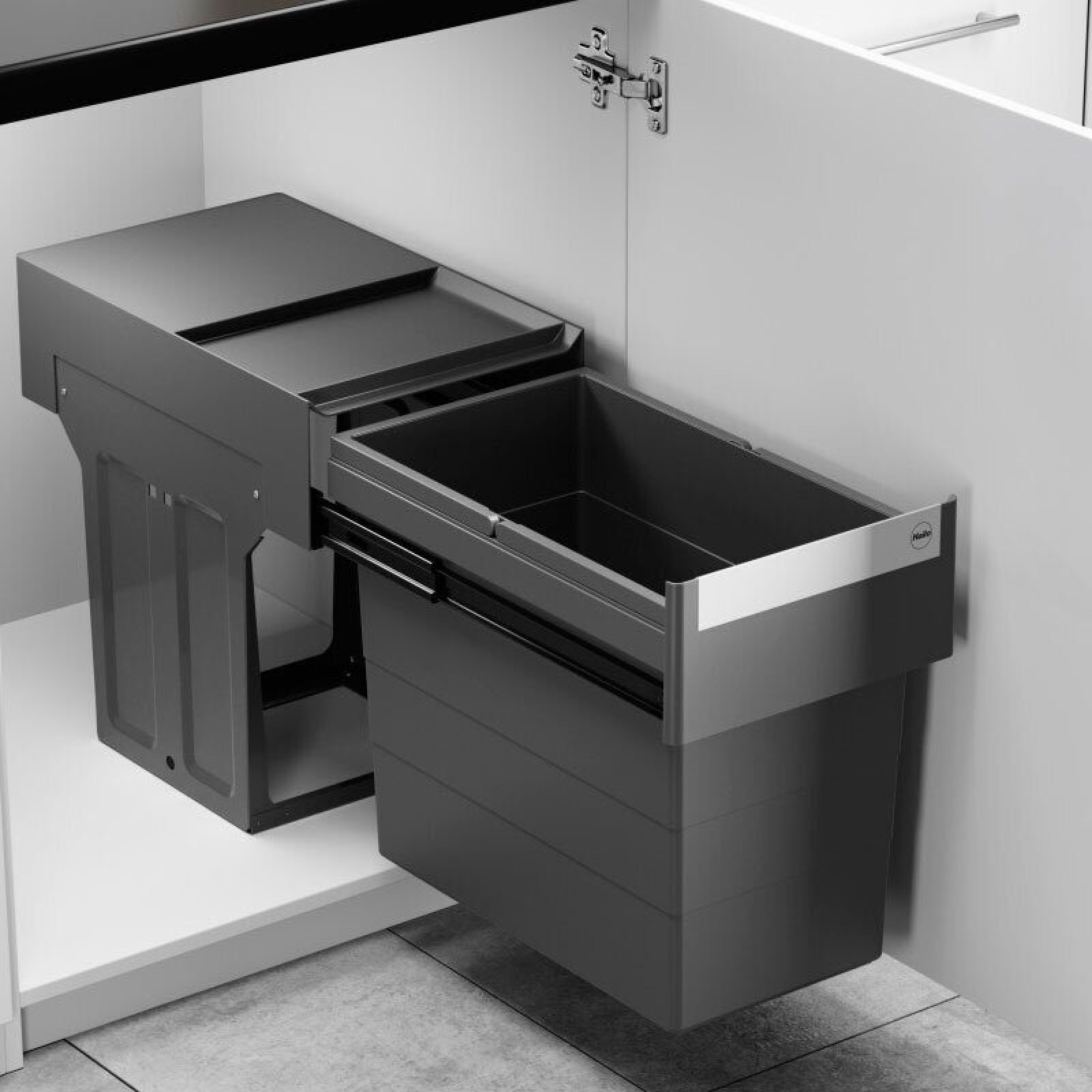 Coșul de gunoi încorporat Hailo Tandem 3666911, cu o capacitate de 28 de litri, este soluția ideală pentru cei care apreciază confortul și curățenia. Instalarea se efectuează pe partea inferioară a dulapului, ceea ce facilitează plasarea altor componente de umplere. Ghidajele cu rulmenți permit extinderea completă a sistemului, în timp ce capacul rămâne la locul său.