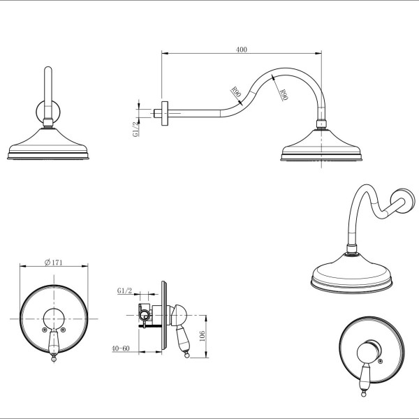 В комплект входят скрытый смеситель, включая корпус, скрытый рычаг, лейка для душа 171 мм с эффектом тропического дождя.